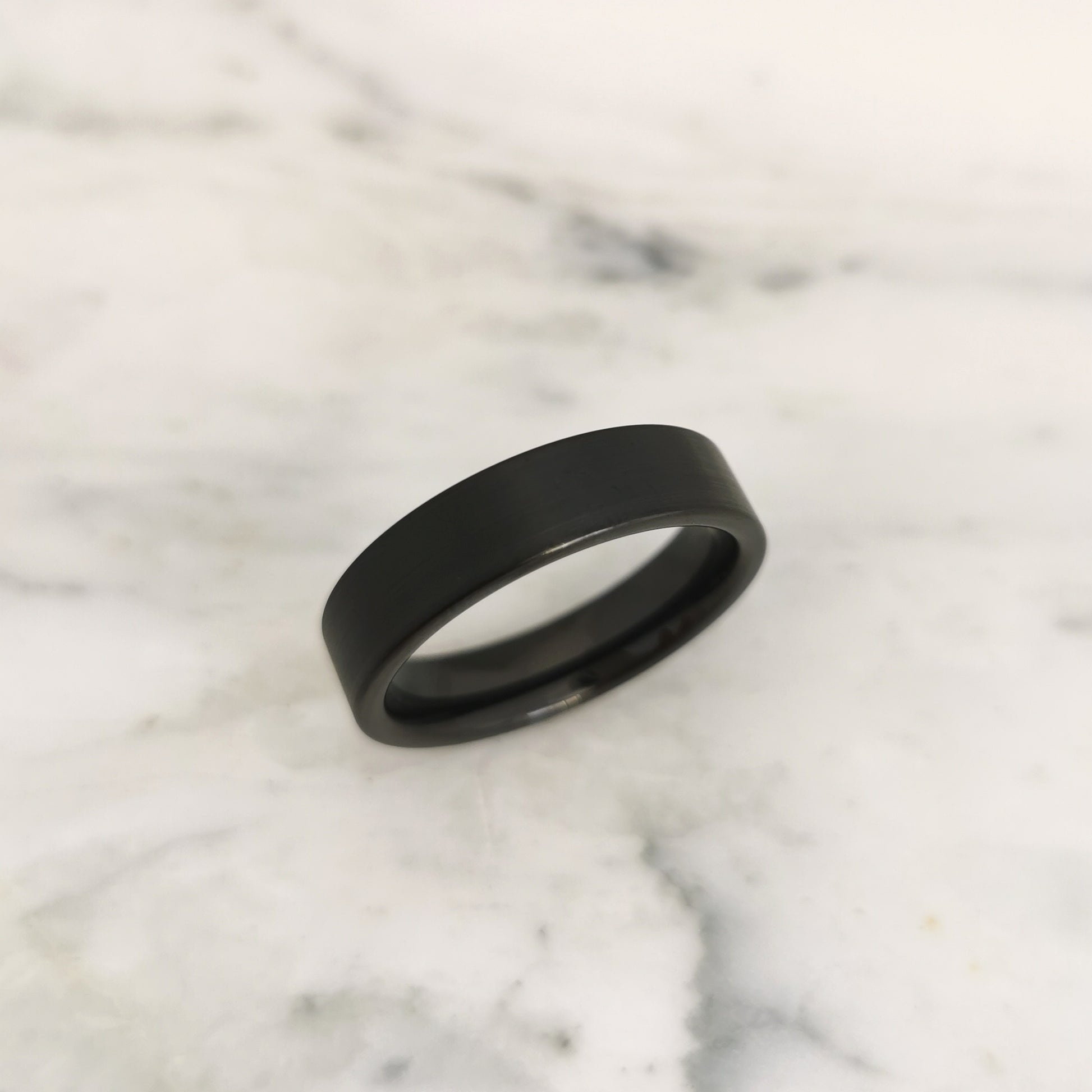 Comfort fit, 6mm wide Tungsten ring with a flat matt black finish on the outside and a polished black interior. It's tough but stylish and comfy too!