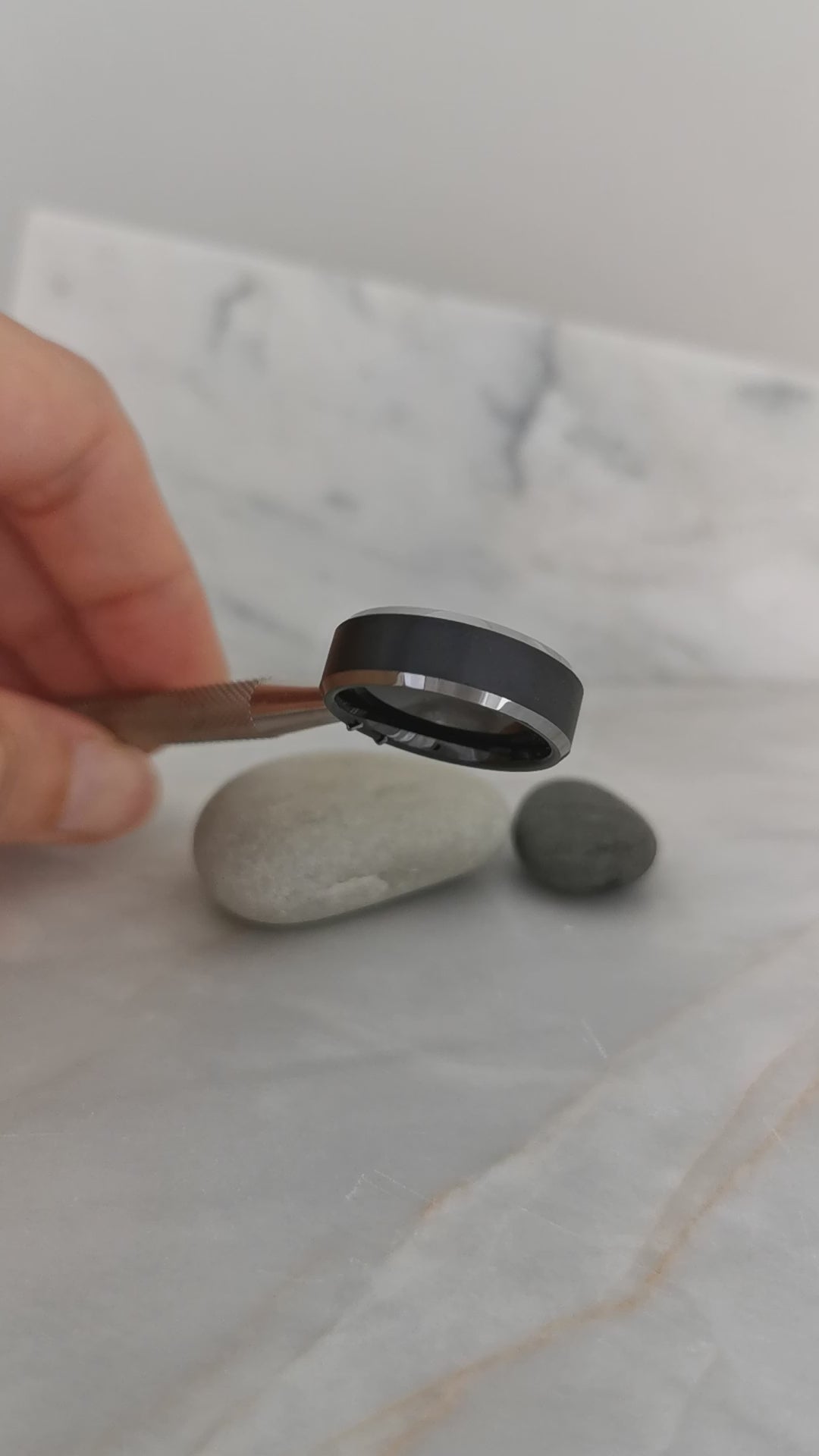 This 8mm wide Tungsten ring is matt black on the outside with bevelled edges that are polished Tungsten for a touch of detail. The inside is rounded for a comfortable fit with a polished black finish.