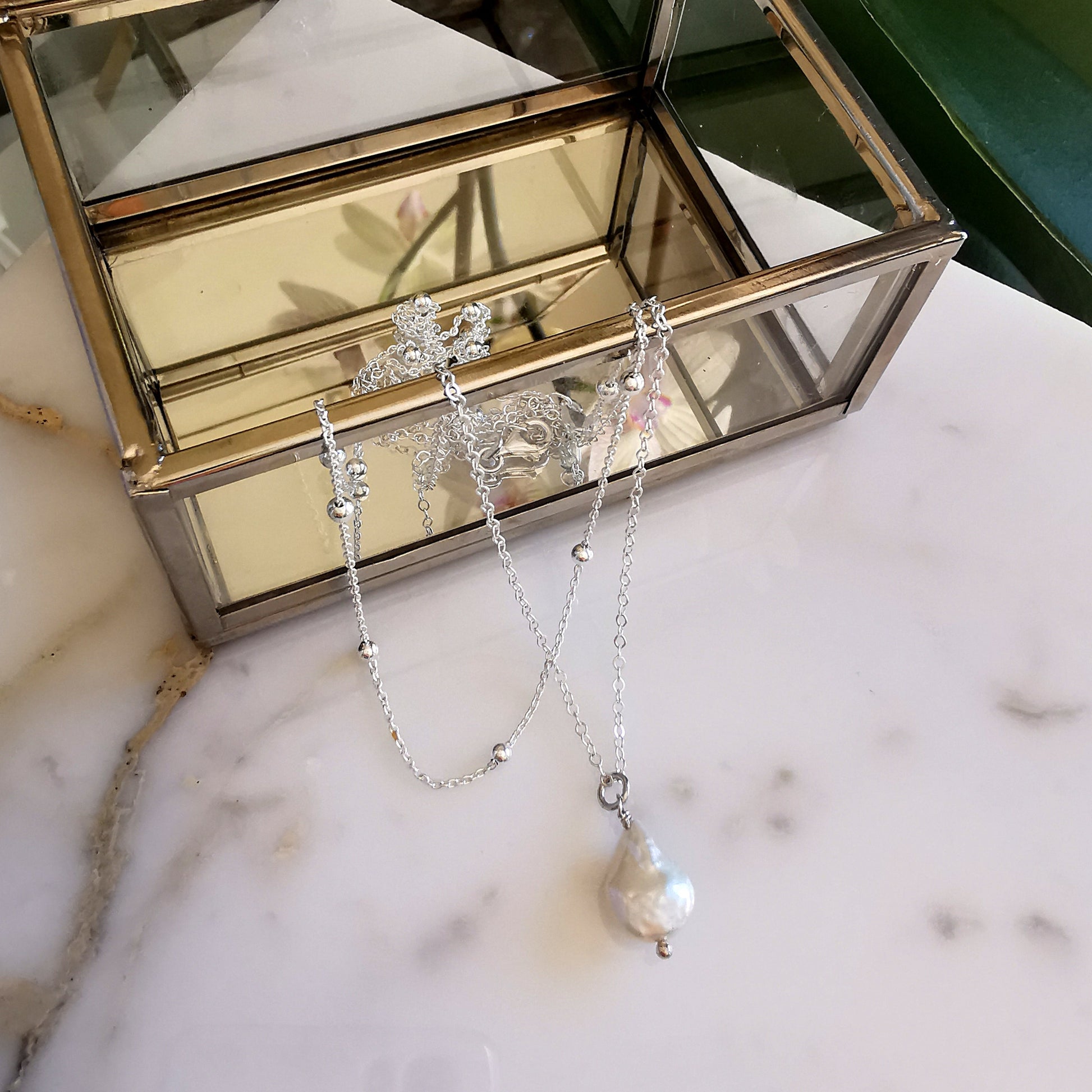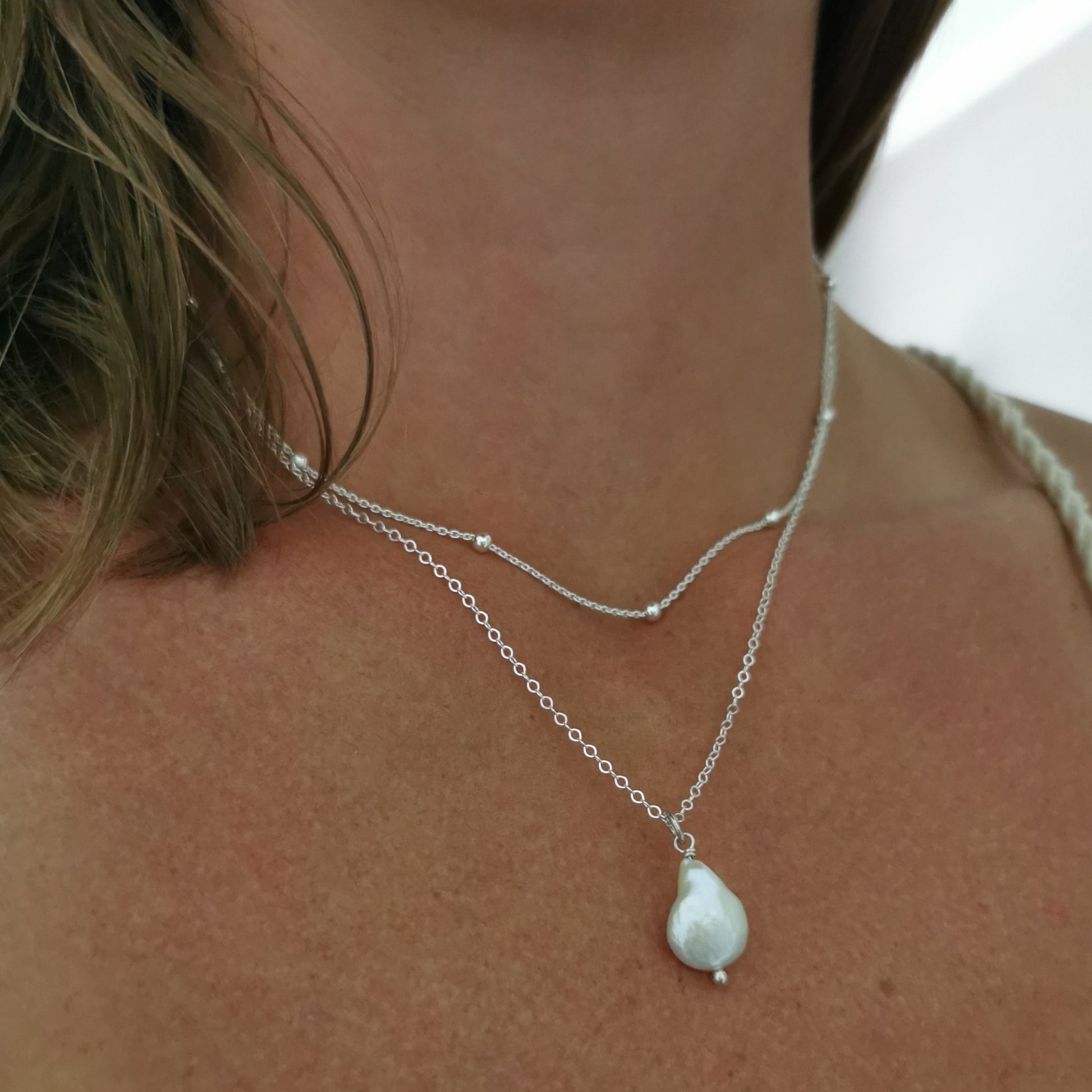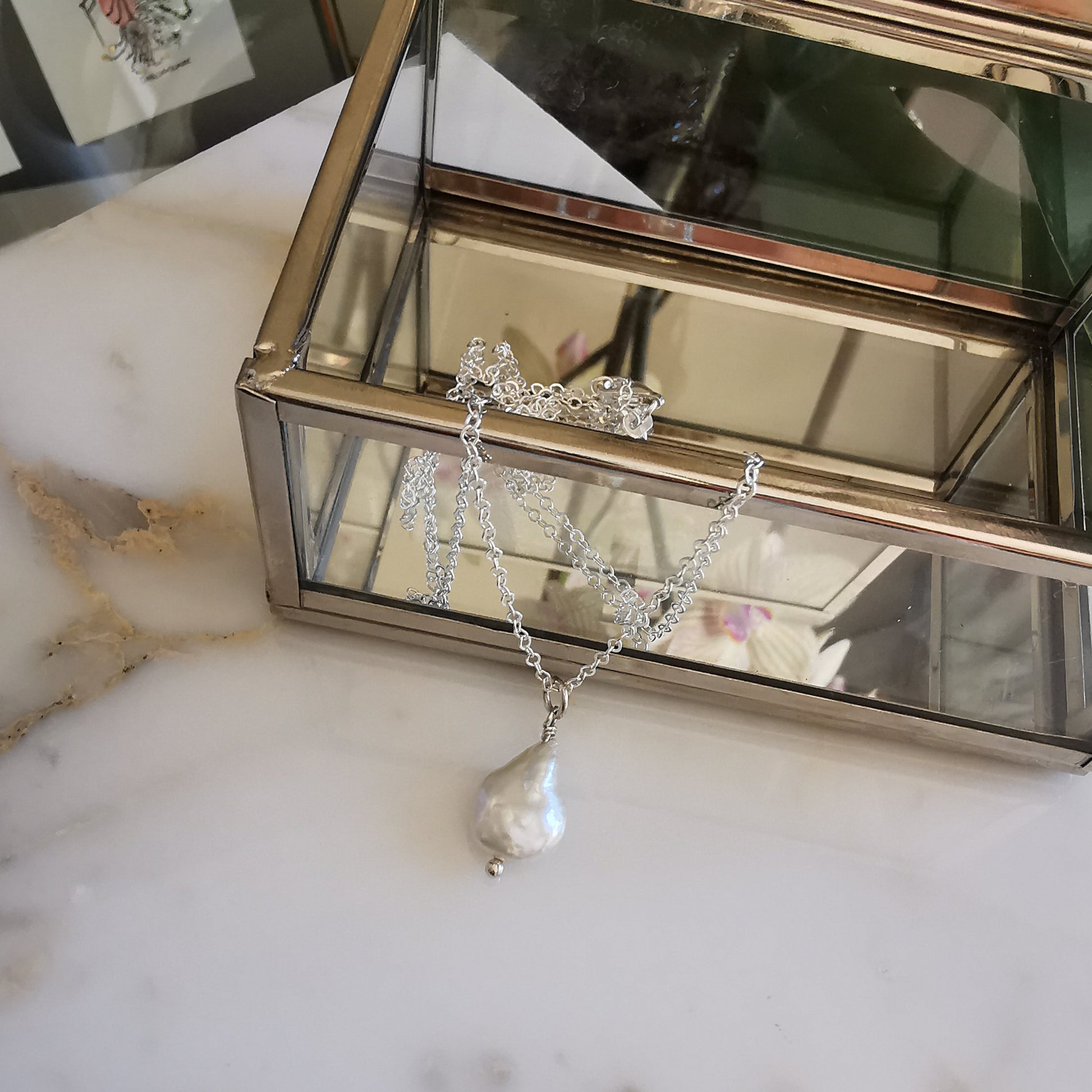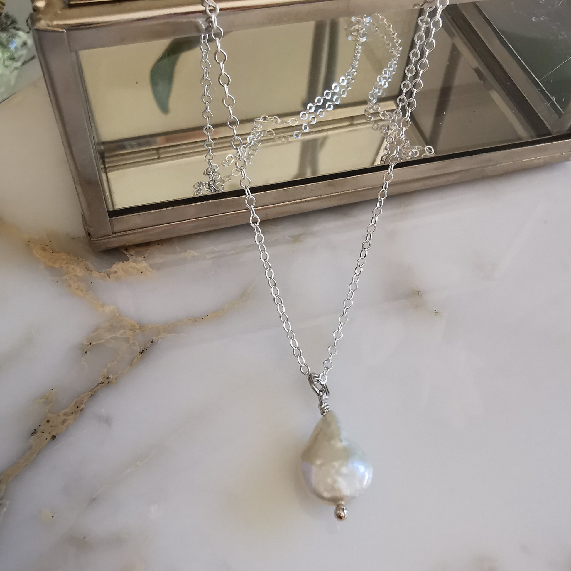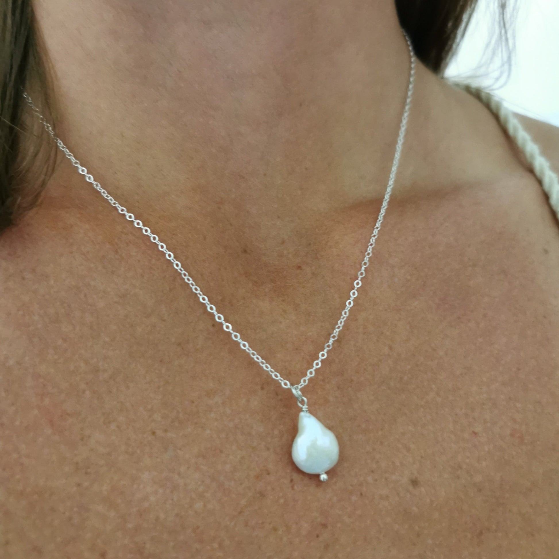 This timeless necklace consists of sterling silver and an organic drop Fresh Water Pearl.
