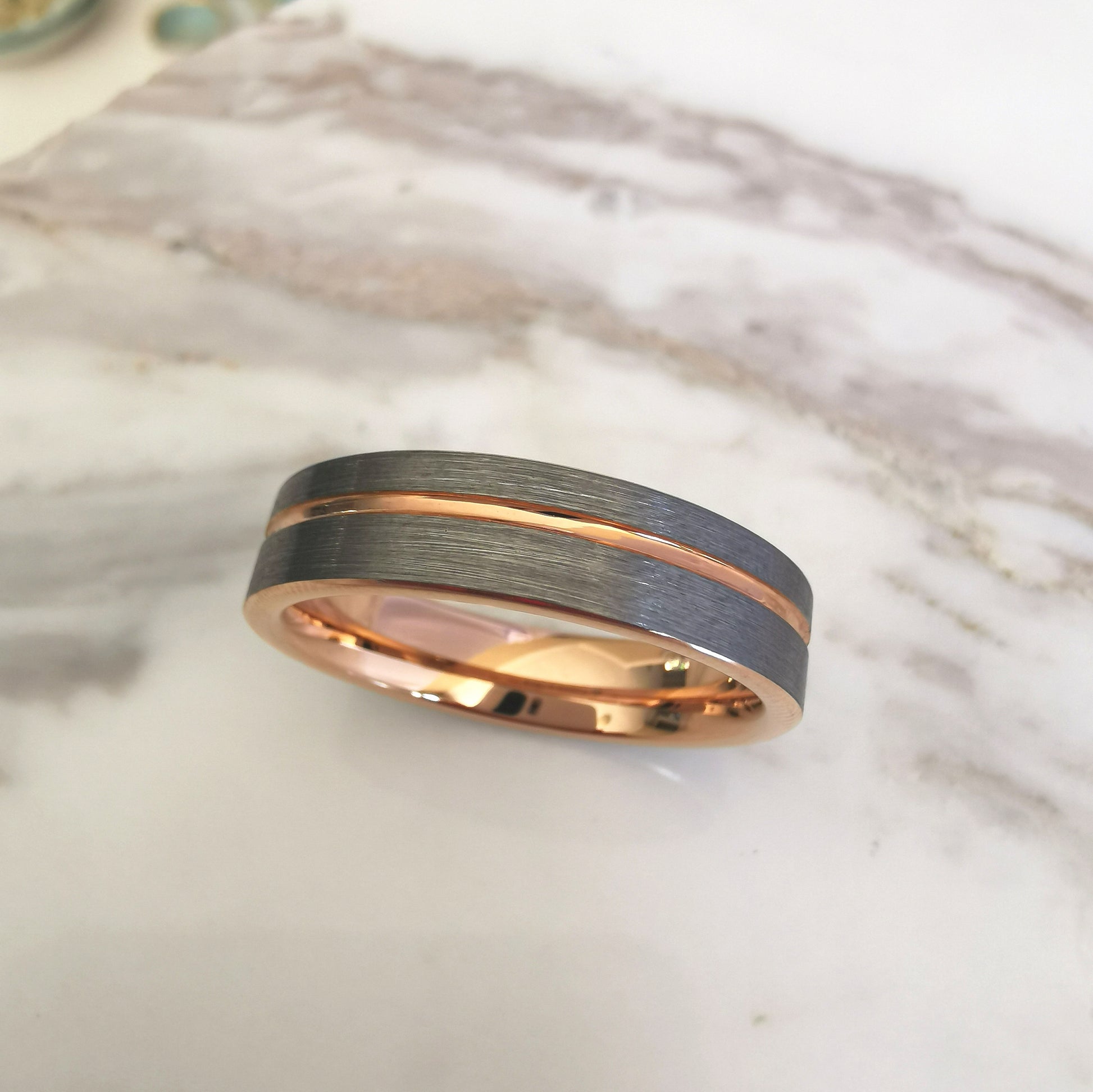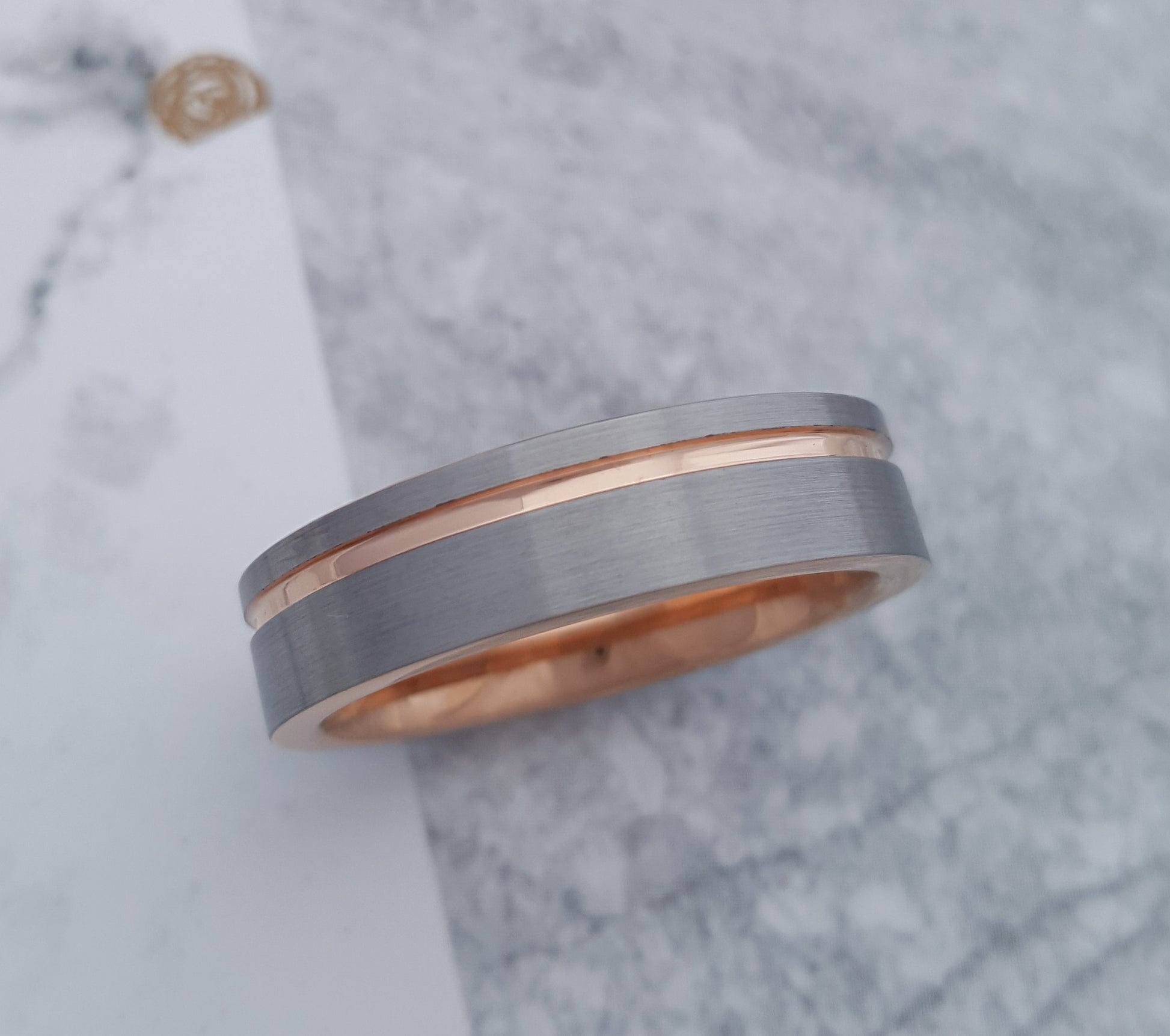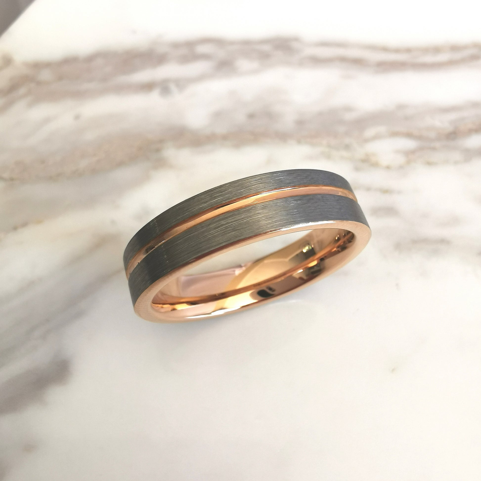 6mm wide comfort-fit Tungsten gents ring, brushed finish on the Tungsten with an off-centre rose gold stripe and rose gold plated interior.