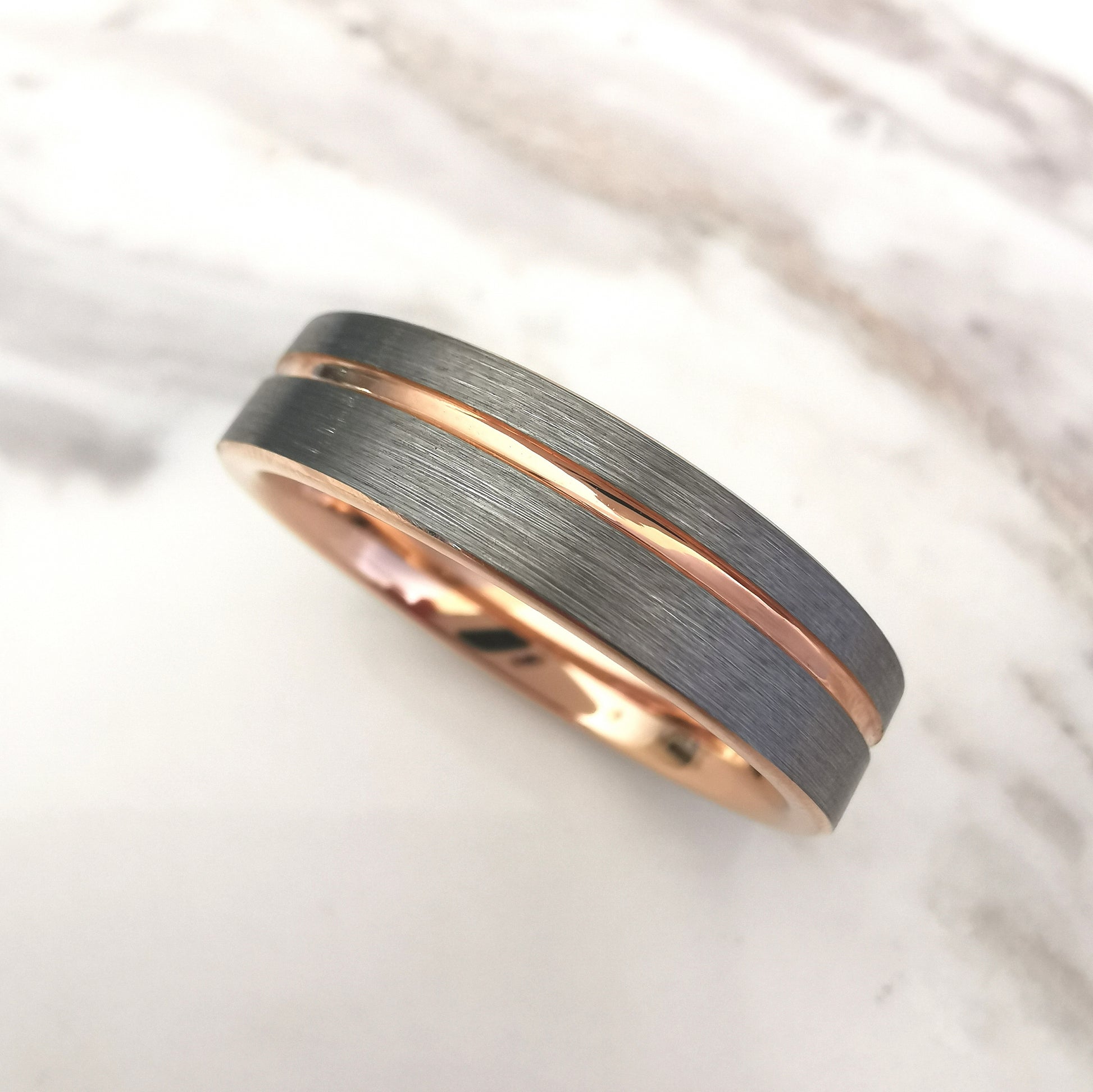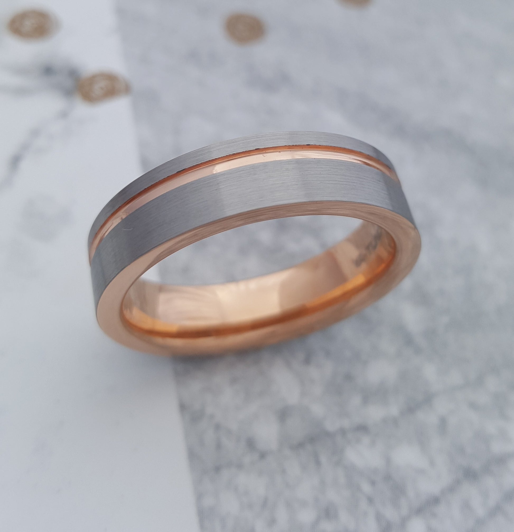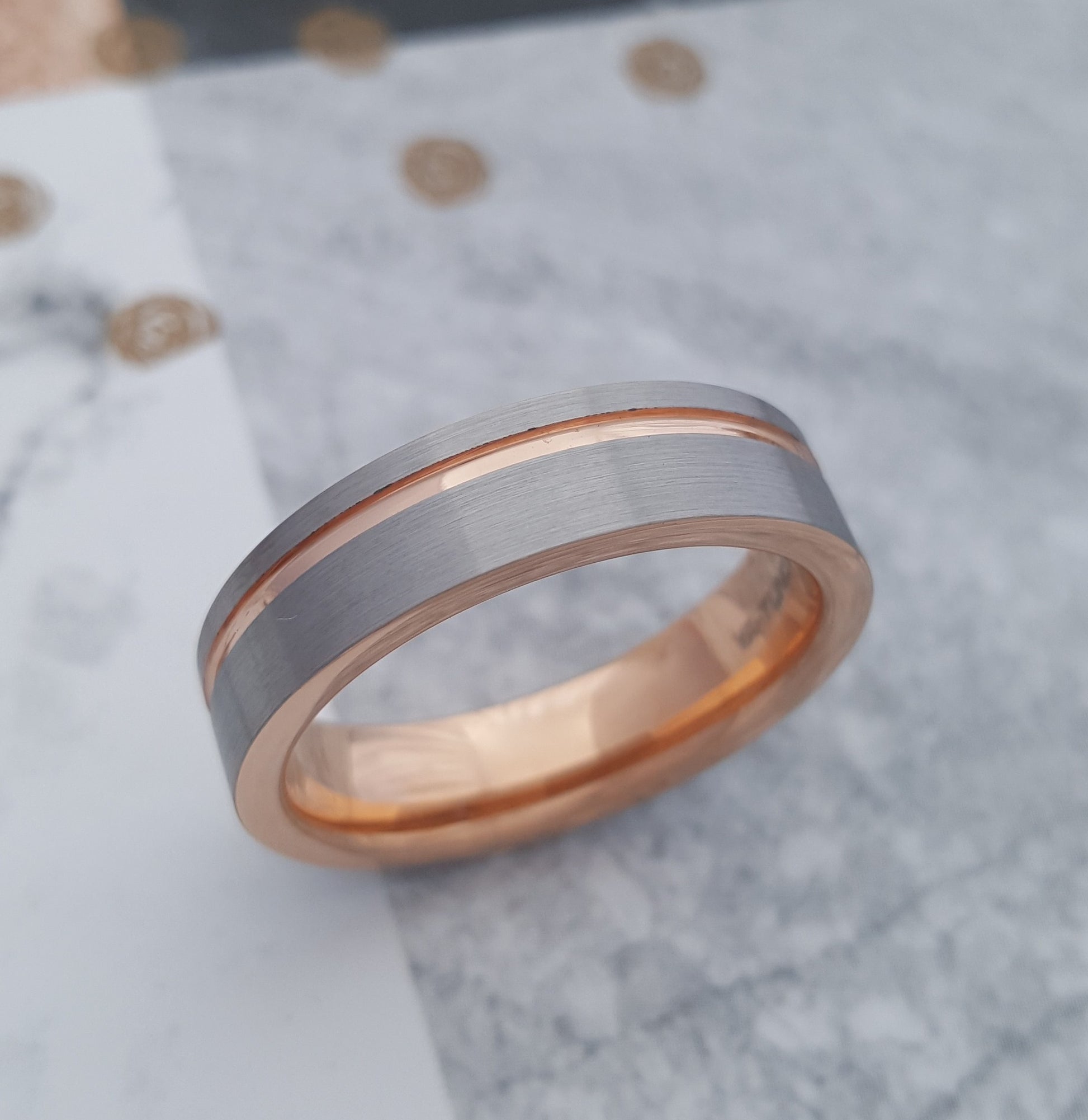 6mm wide comfort-fit Tungsten gents ring, brushed finish on the Tungsten with an off-centre rose gold stripe and rose gold plated interior.