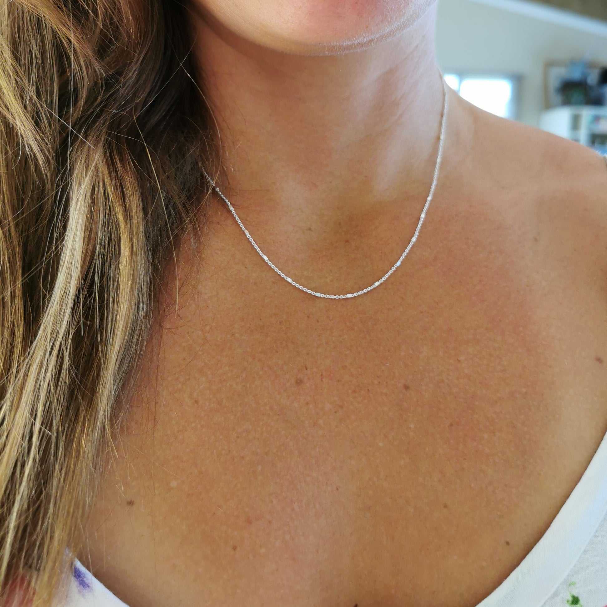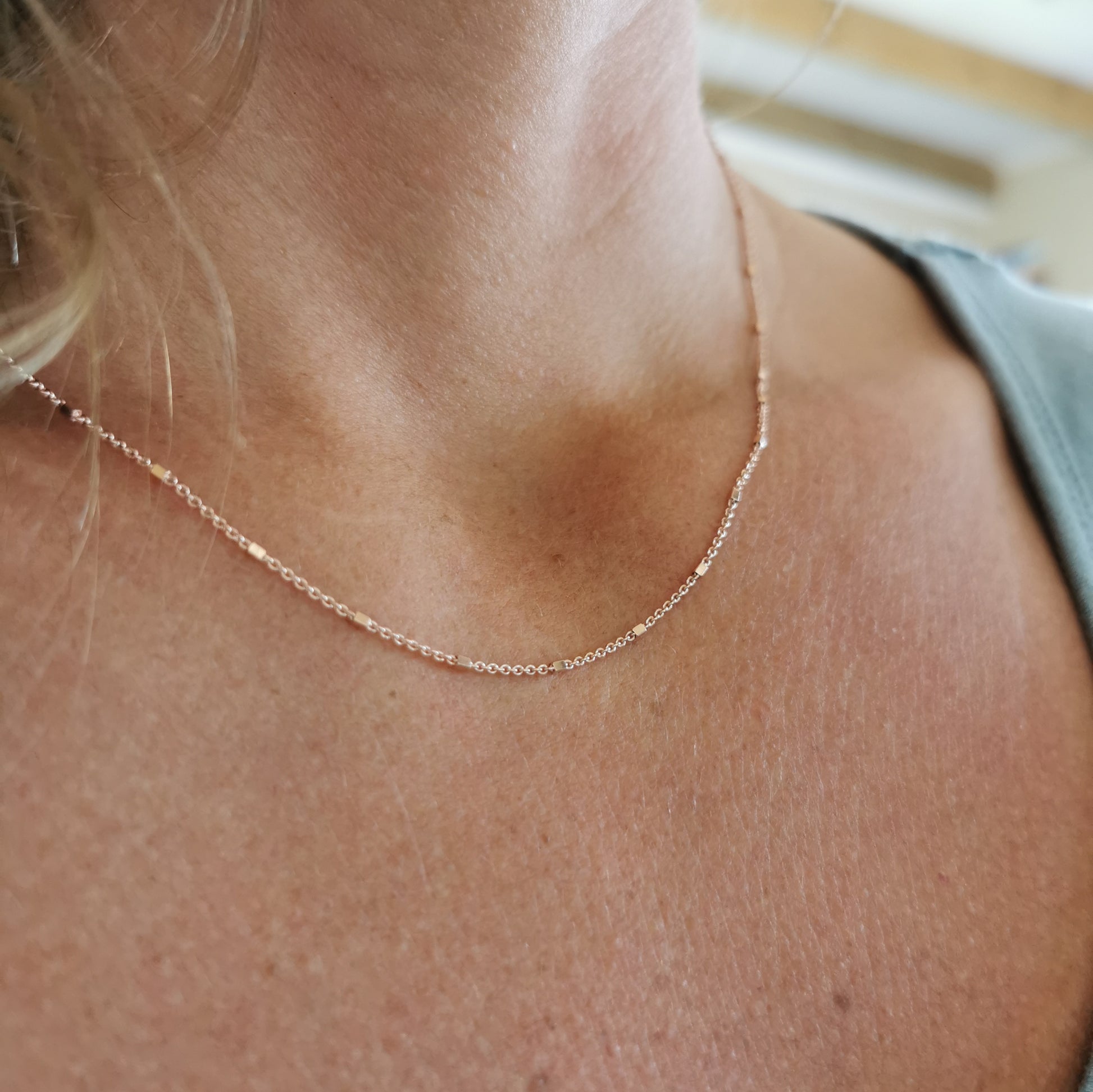 These fine chains have tiny rectangular tubes spread out across the chain which catch the light as you were them.