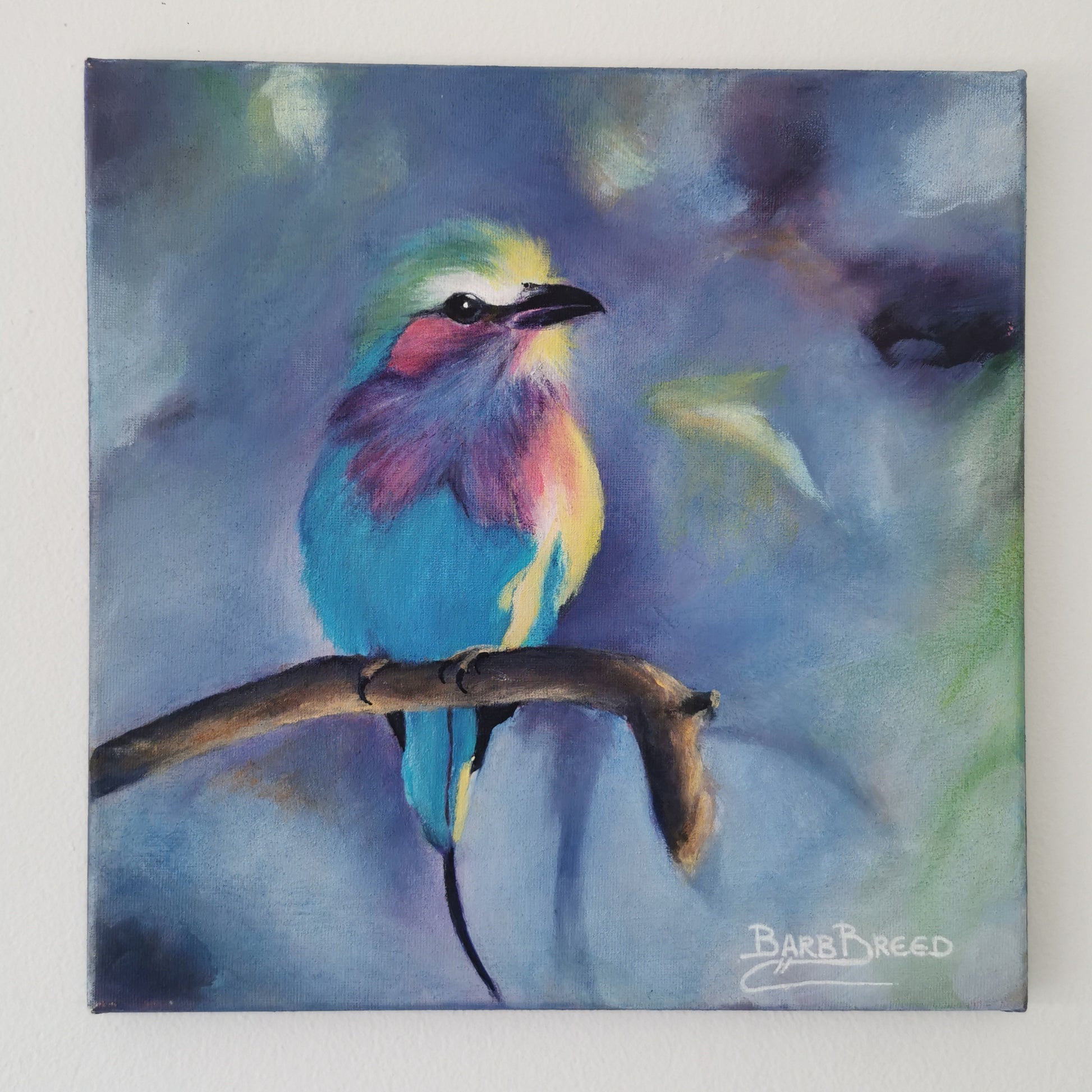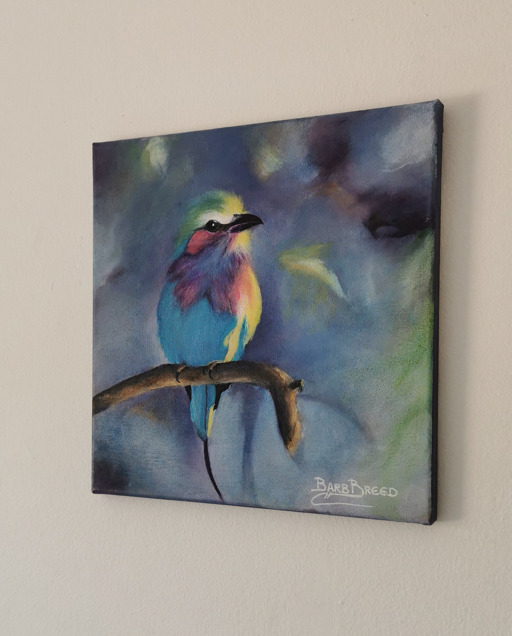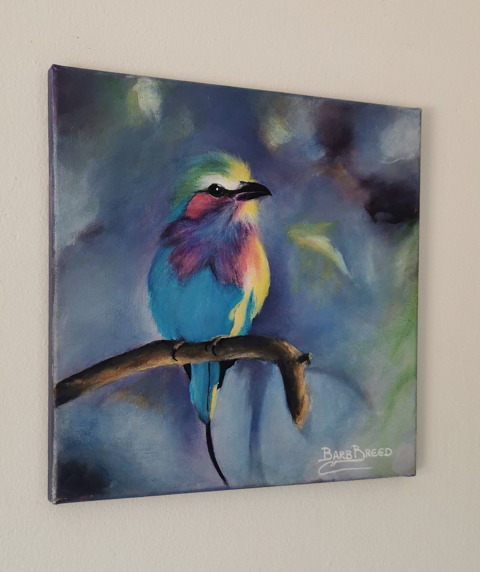 This gorgeous original artwork measures 30cm x 30cm and features a beautiful and iconic Lilac Breasted Roller catching the morning light at sunrise.