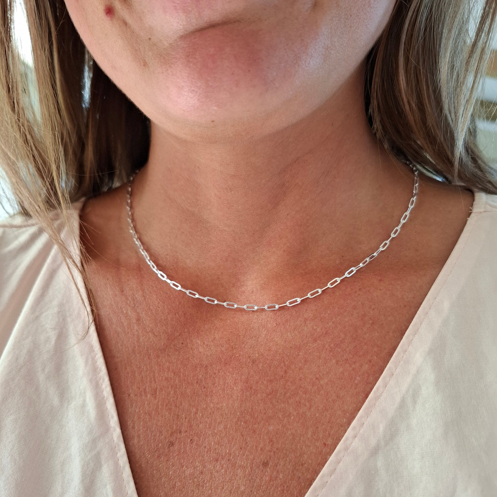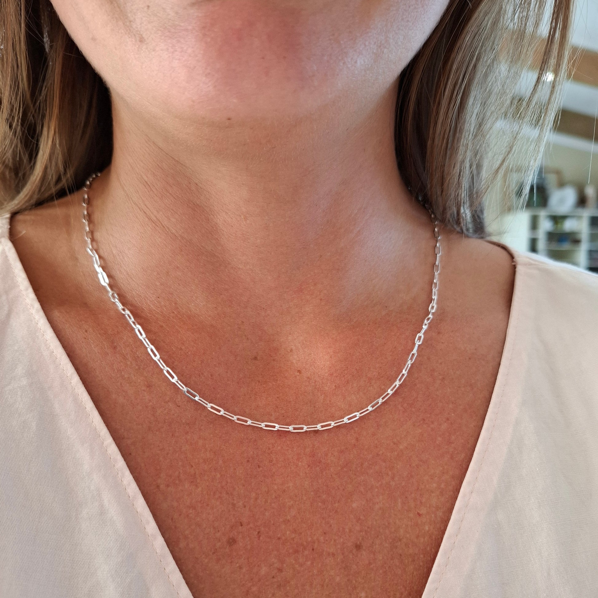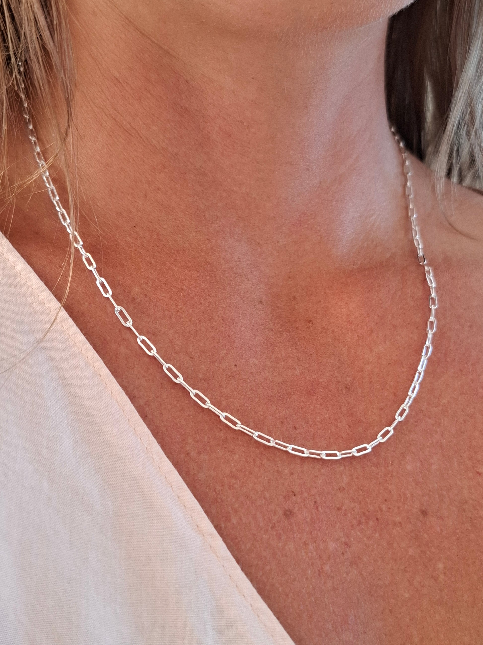 Elevate your South African jewellery collection with this striking sterling silver paperclip chain, designed for effortless style and versatility. The modern paperclip necklace consists of solid sterling silver links each measuring +- 2.3mm wide and 6mm long.