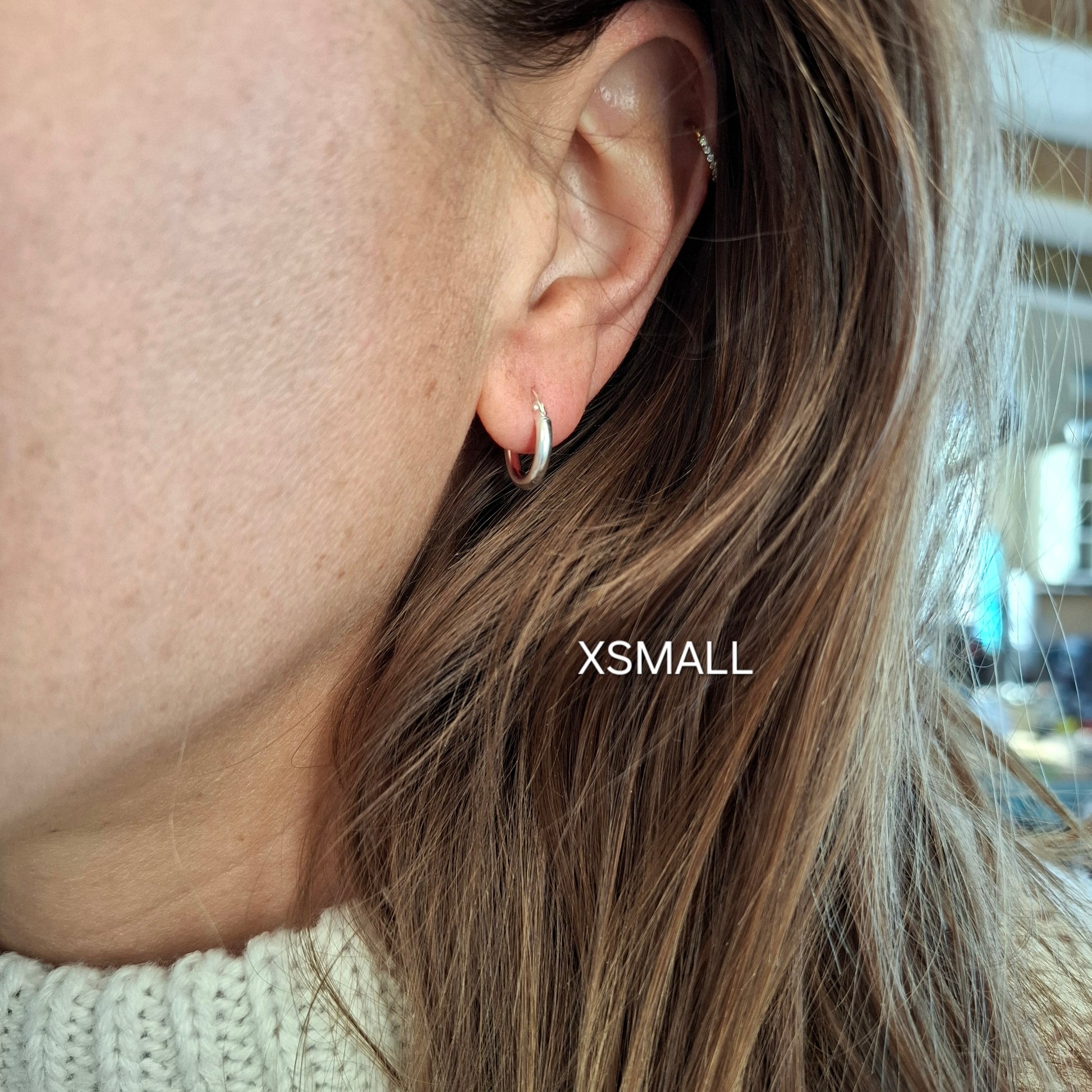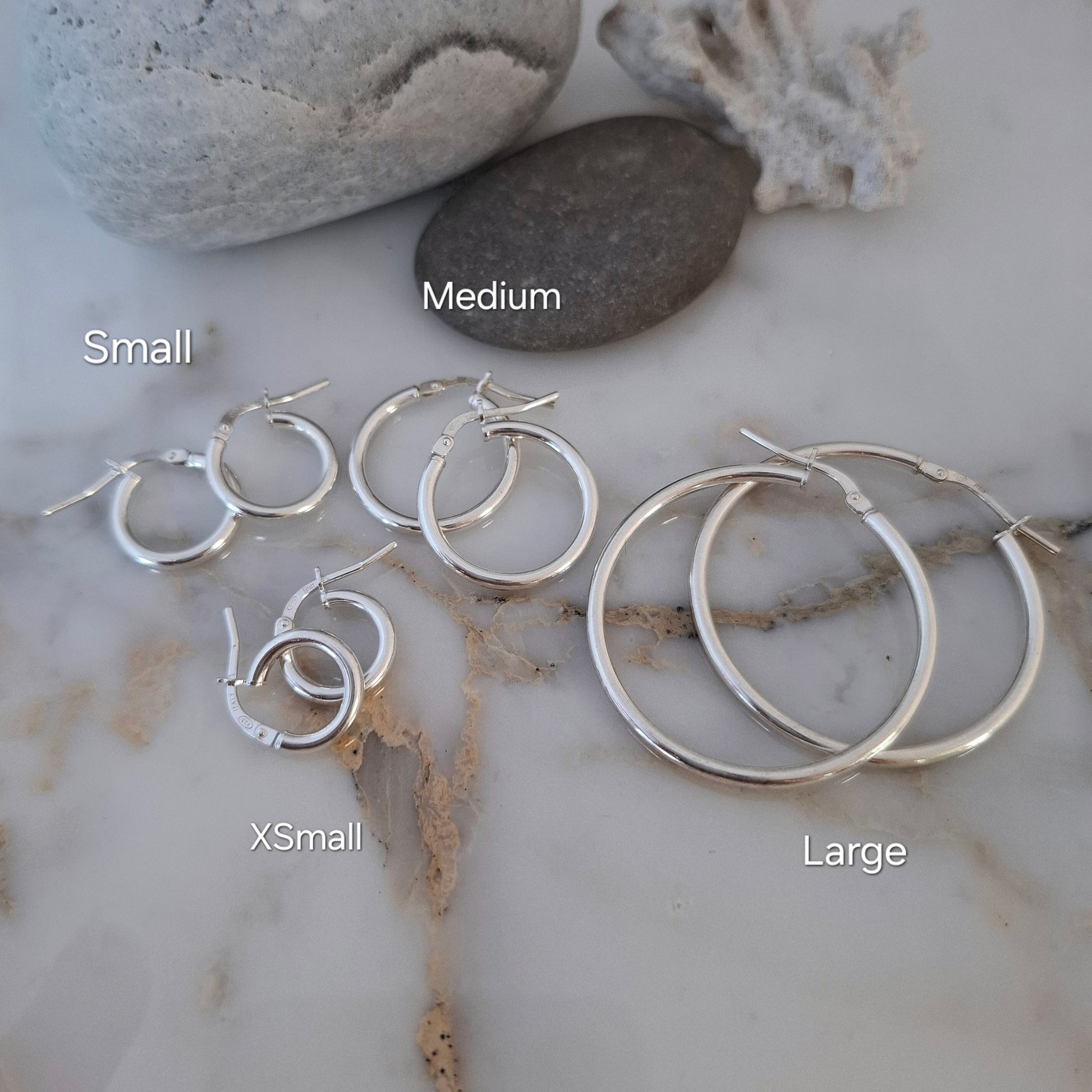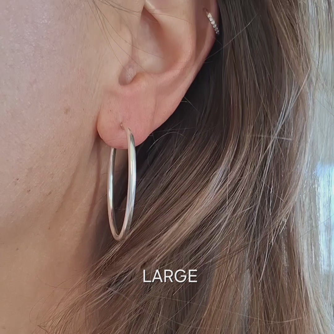 Available in 4 sizes from ranging from XSmall to Large. These everyday silver hoops look gorgeous whether worn solo, stacked alongside one another , or paired with your favourite gemstone charms dangling at the bottom.