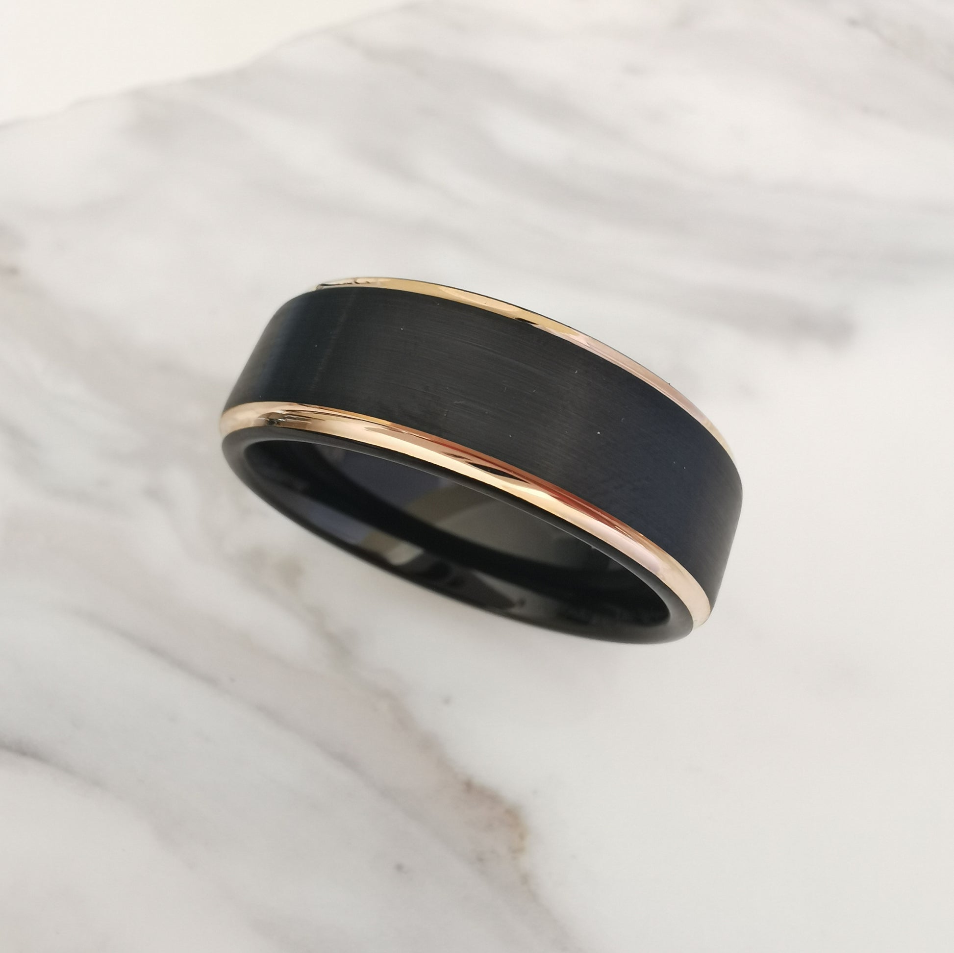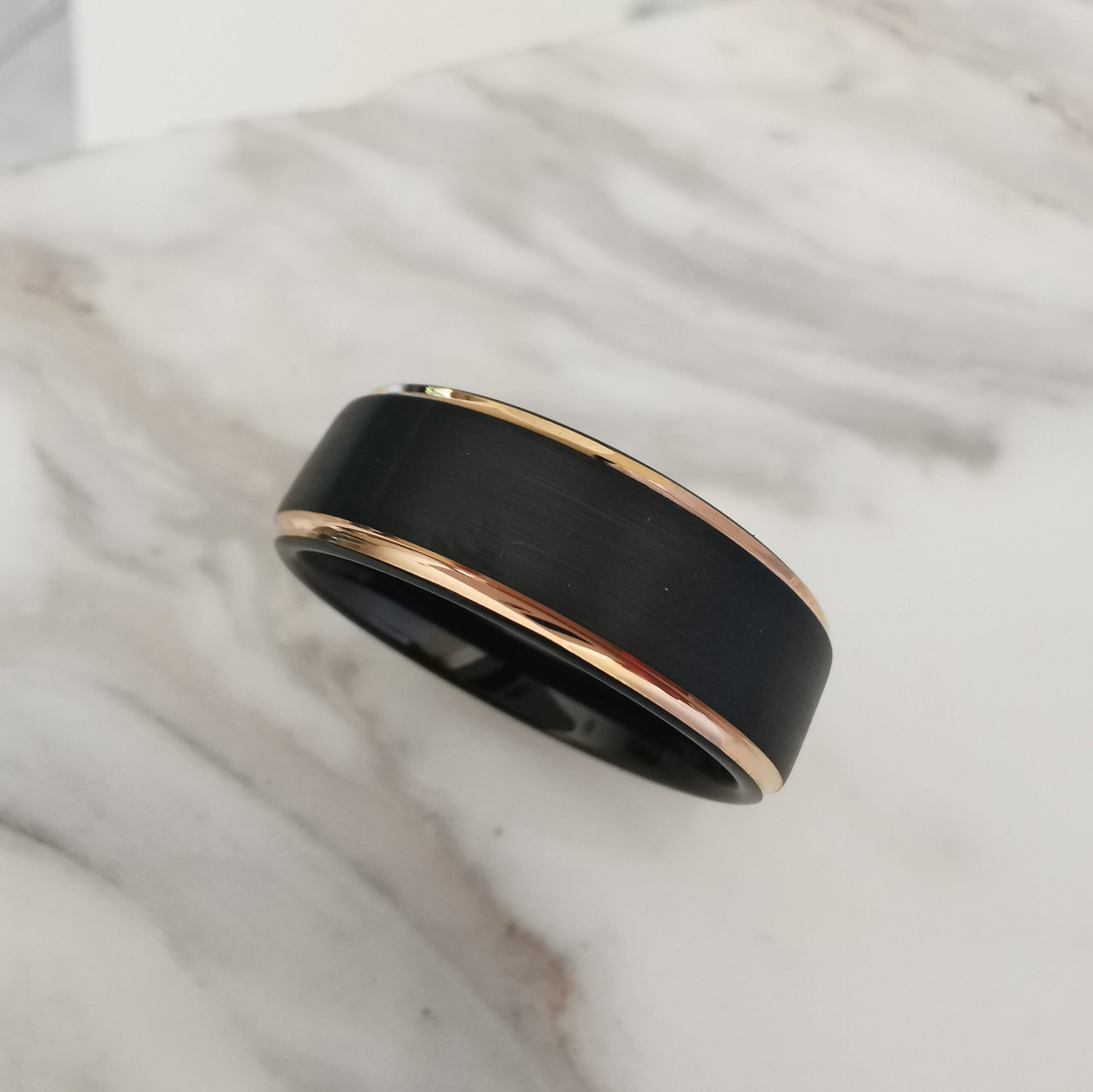 8mm Wide Black Tungsten Ring with Rose Gold Plated Edges