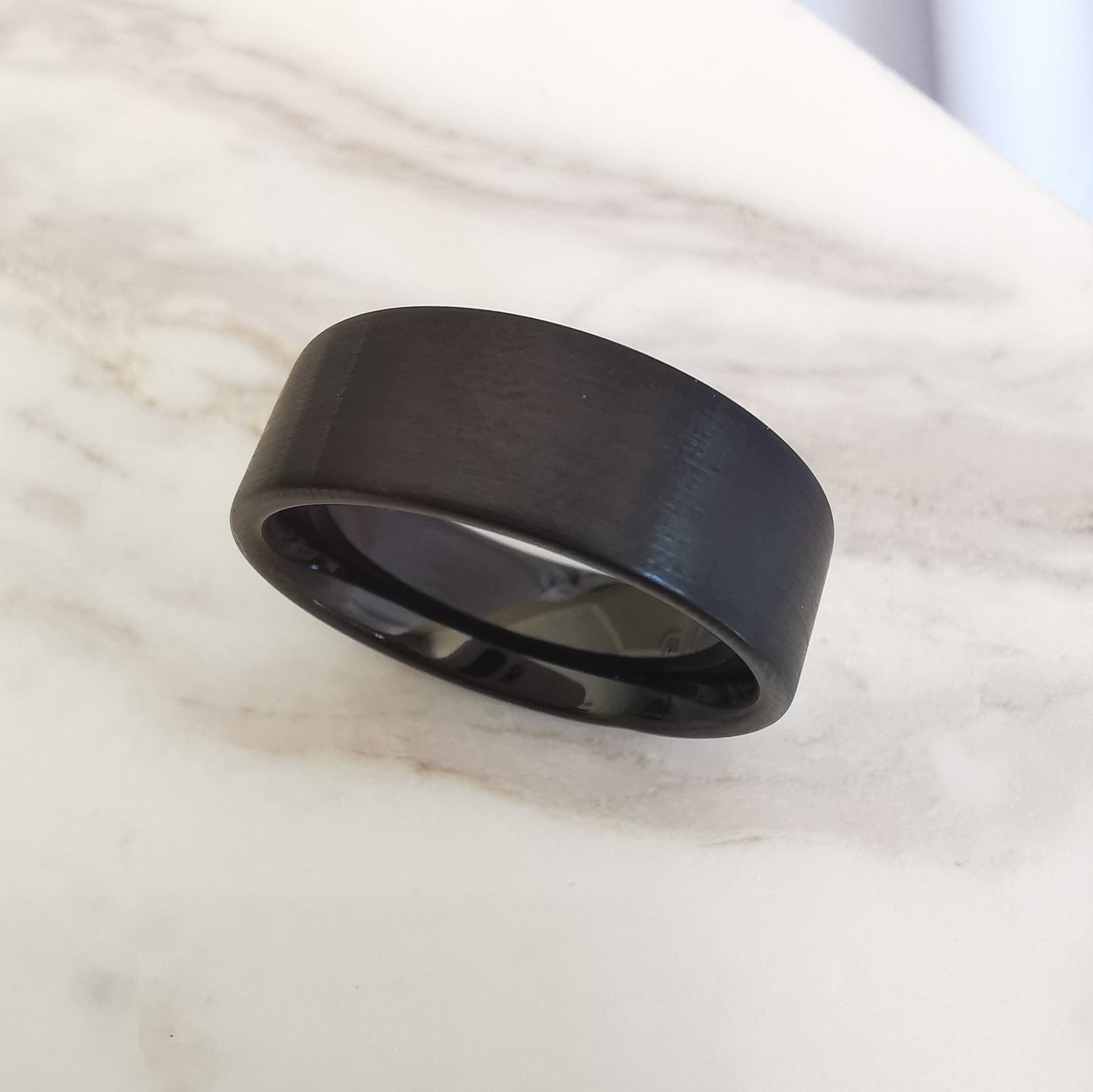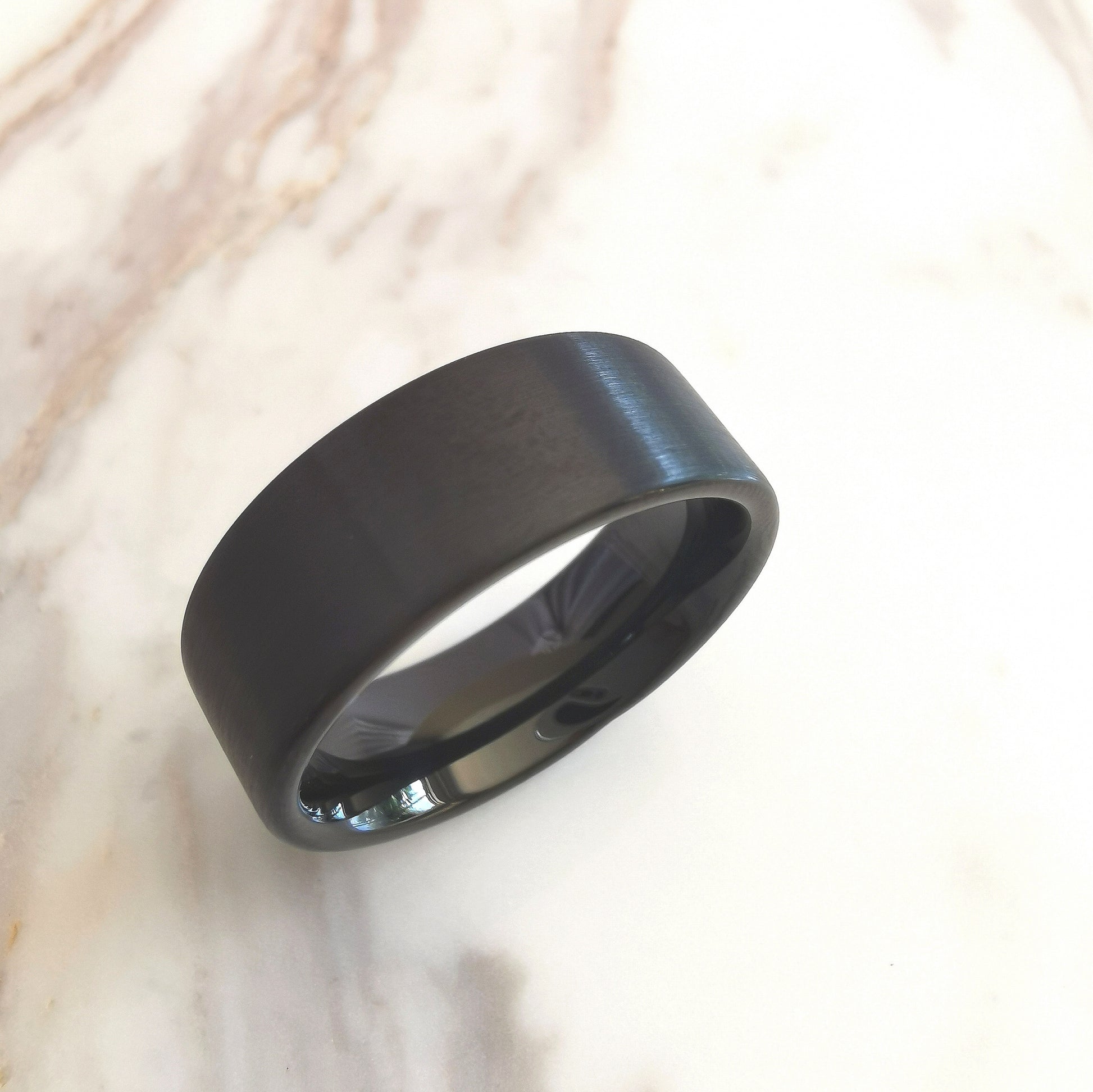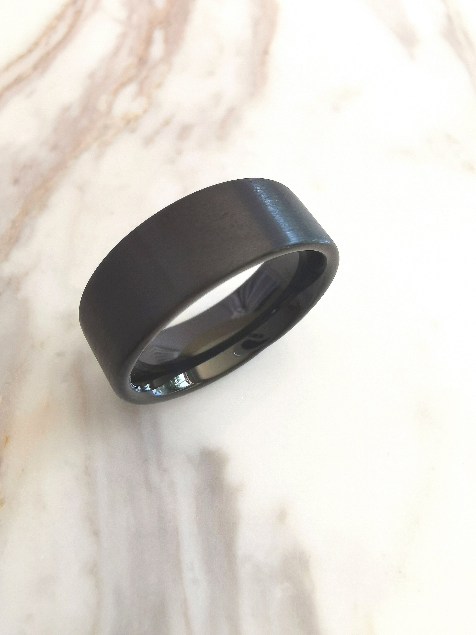 This matt black 8mm wide Tungsten ring is flat on the outside with a matt black finish and rounded on the inside with a polished black finish, for extra comfort.