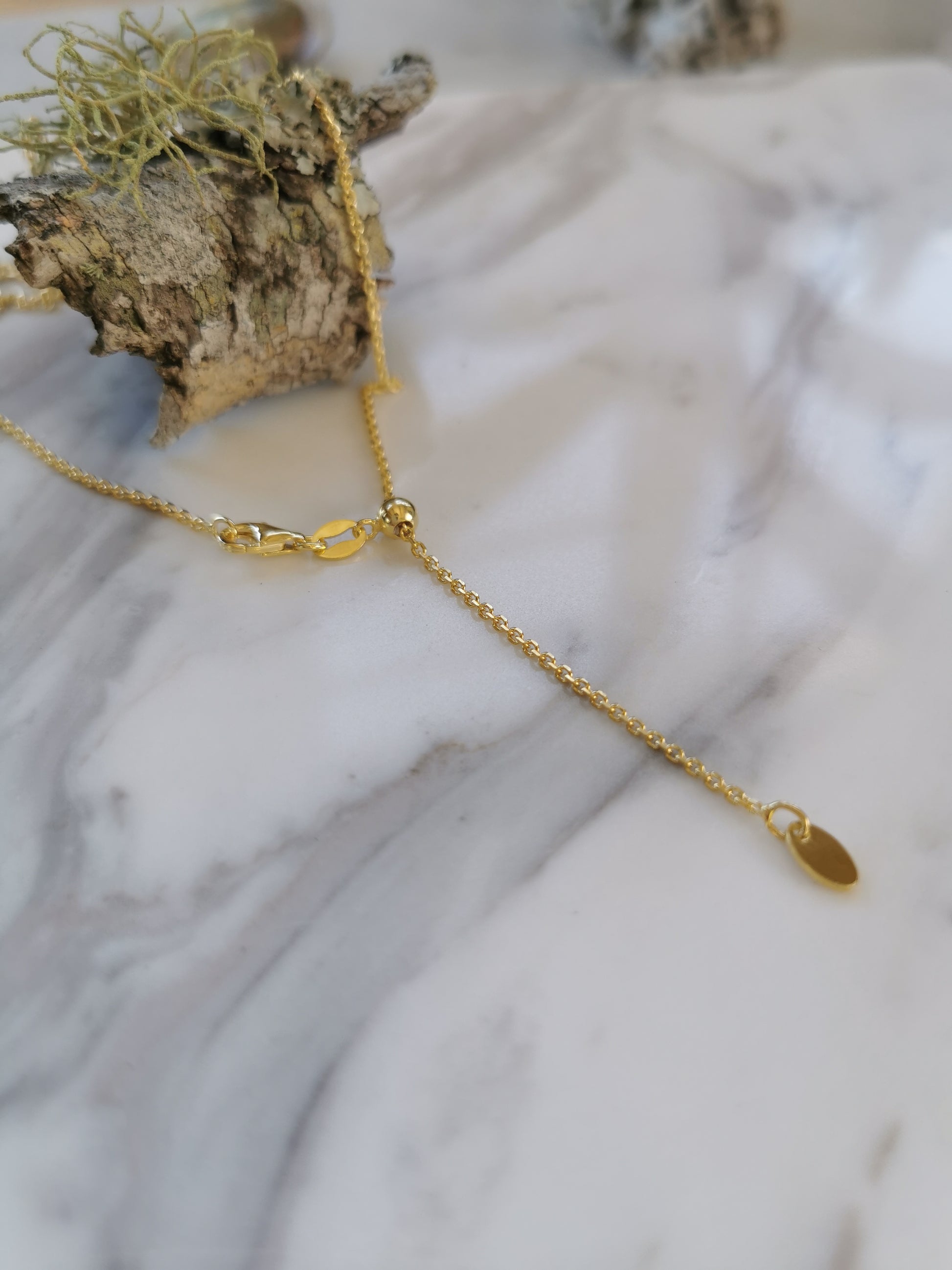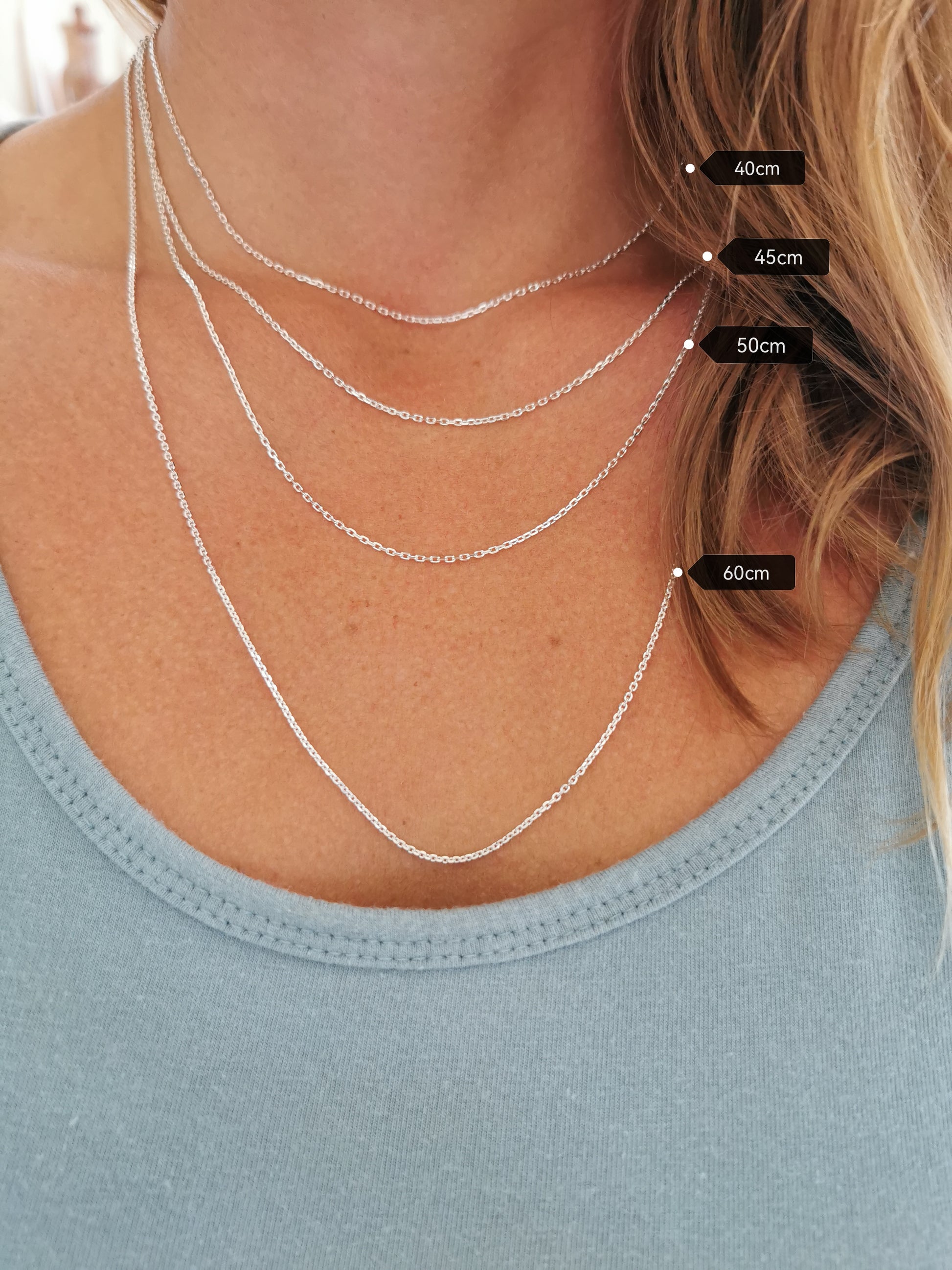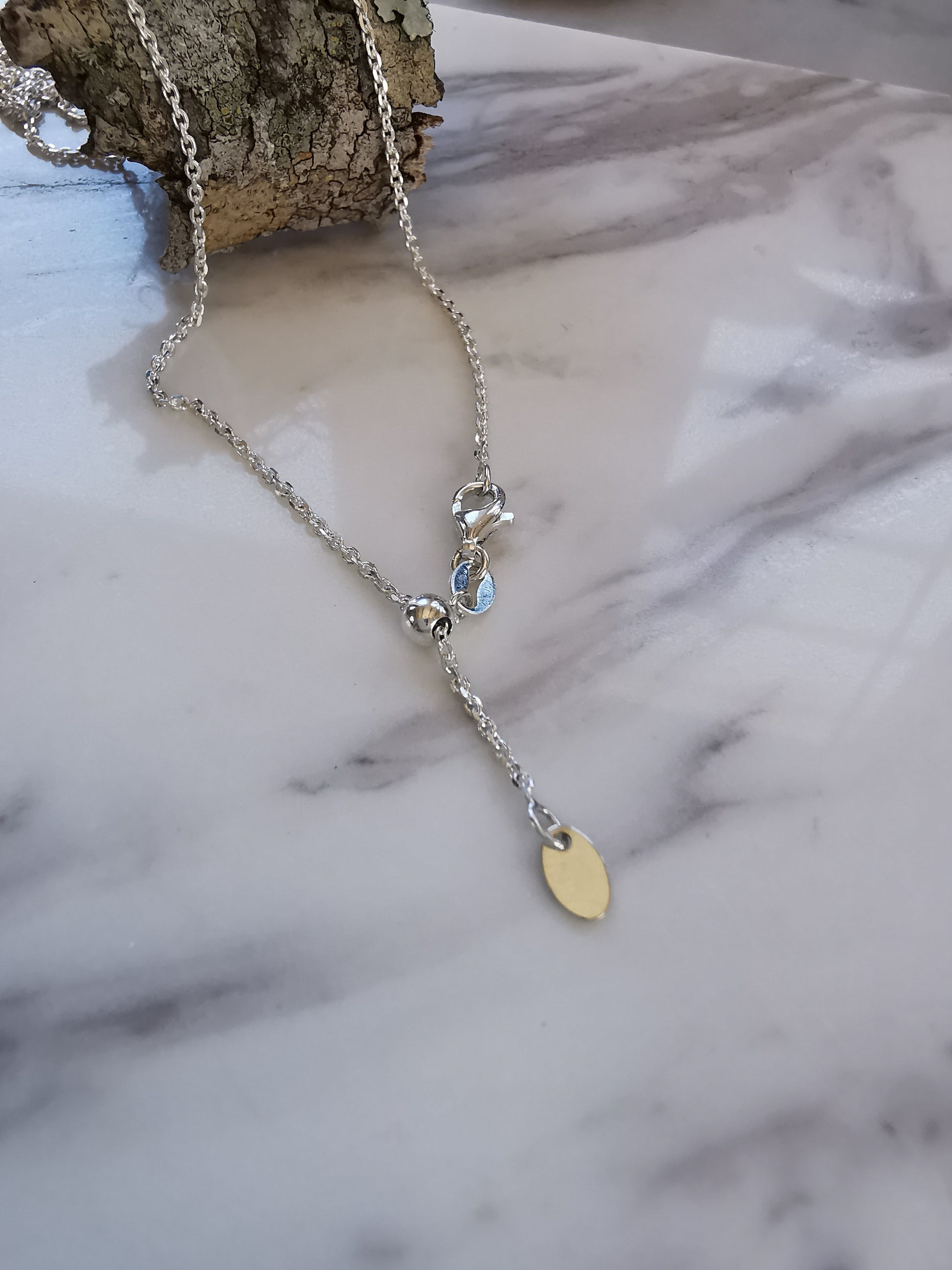 Available in a variety of lengths and 3 different finishes. The Slider options are AMAZING as they adjust in length so you can wear them with any outfit or neckline. So you never need to purchase another silver chain as you can simply grab the little bead on the end and adjust it to your preferred length on any given day. The length given for each slider option is the maximum length of that option. The slider bead sits at the back of the chain so it isn't seen.