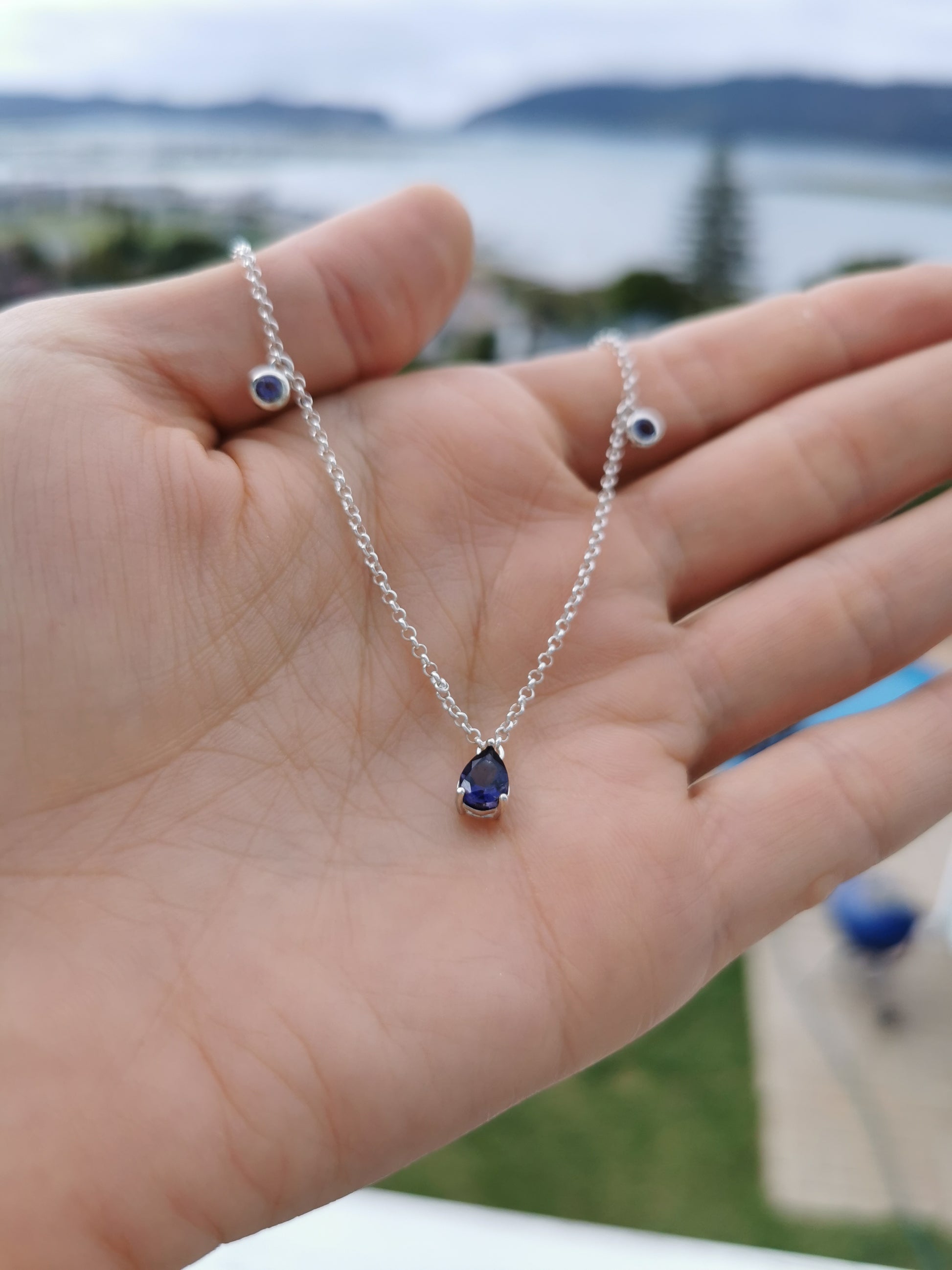 A 7mm by 5mm Pear Cut Iolite dangles delicately at the bottom of this striking necklace. This is accompanied by two 3mm Round Cut Iolites dangling slightly further up the chain for a dash of extra sparkle.