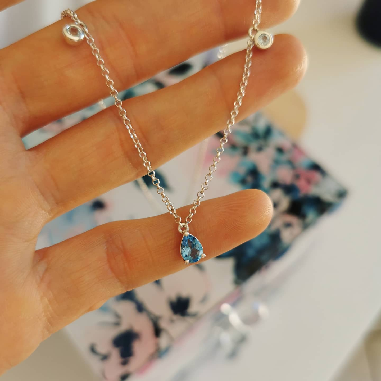 This stunning solid sterling silver necklace set with an ombré selection of genuine blue topaz gemstones.