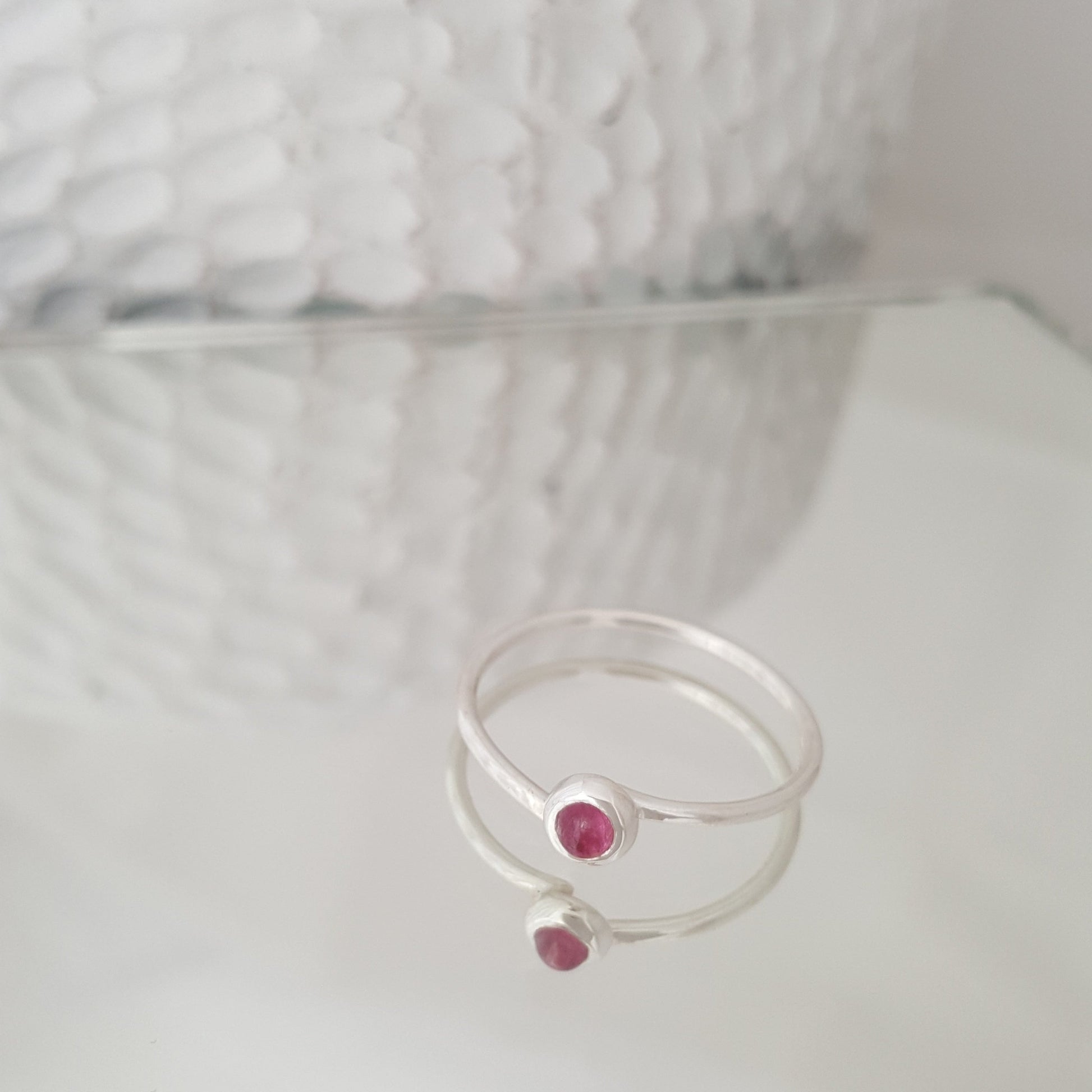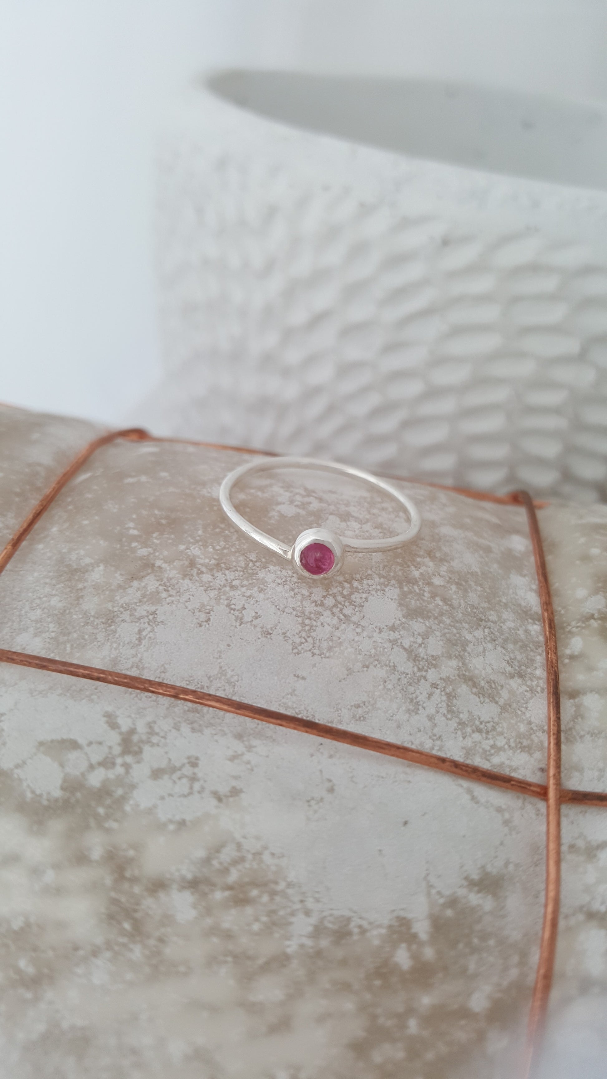 This pink pretty is hand-made from sterling silver and set with a 3mm cabochon cut pink Tourmaline. The band has a slight curve to it on either side.