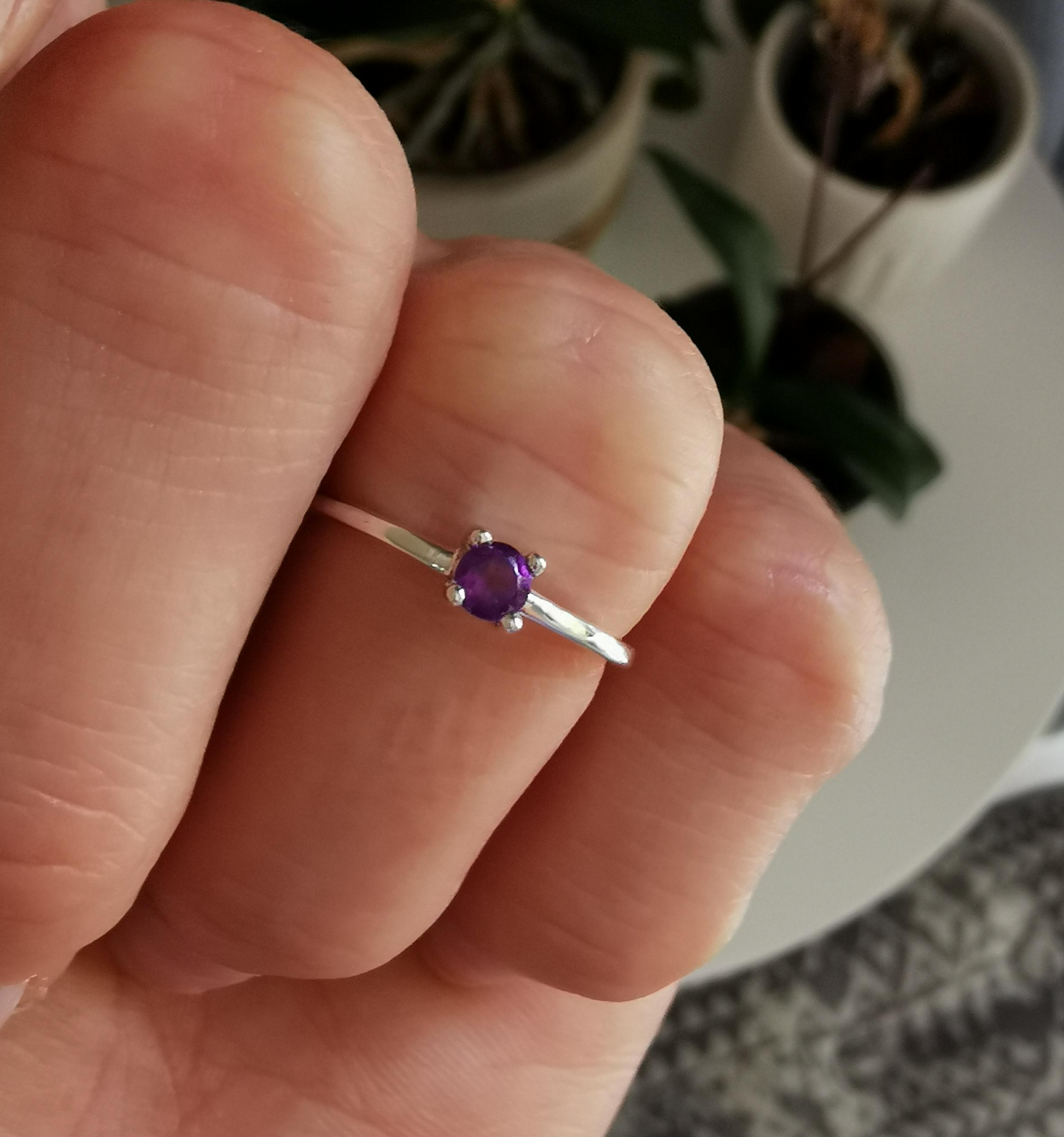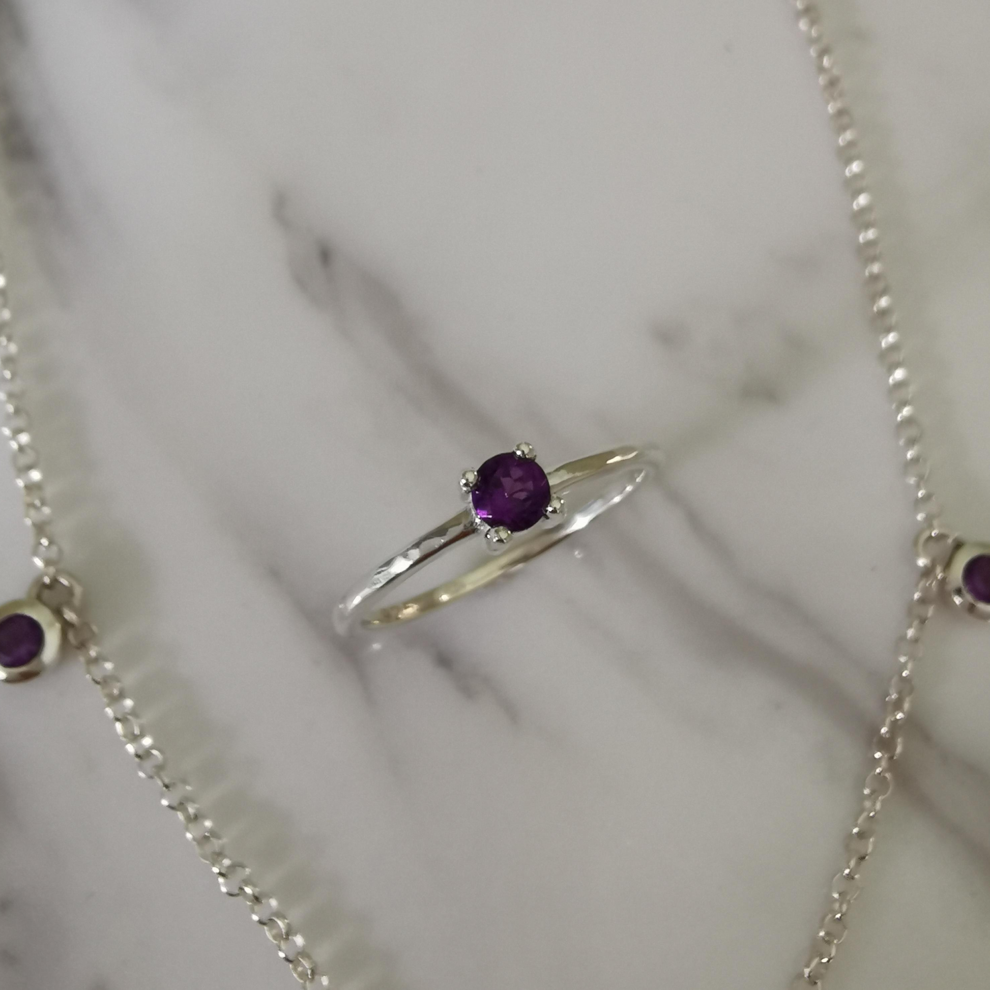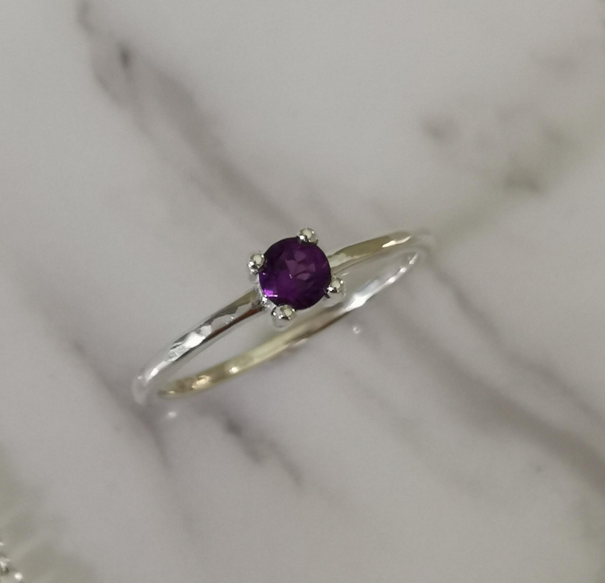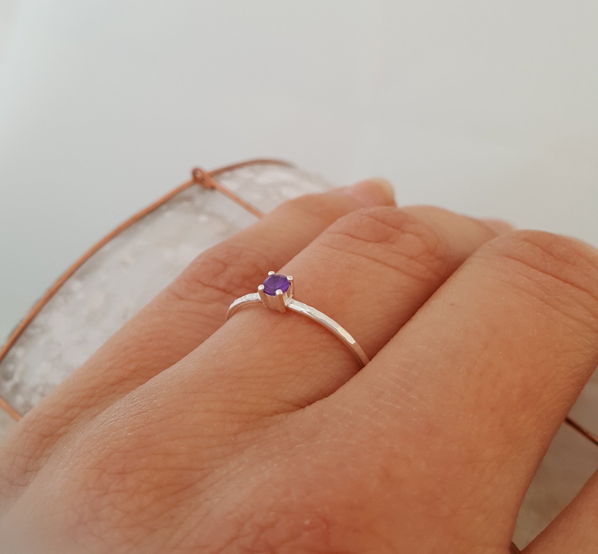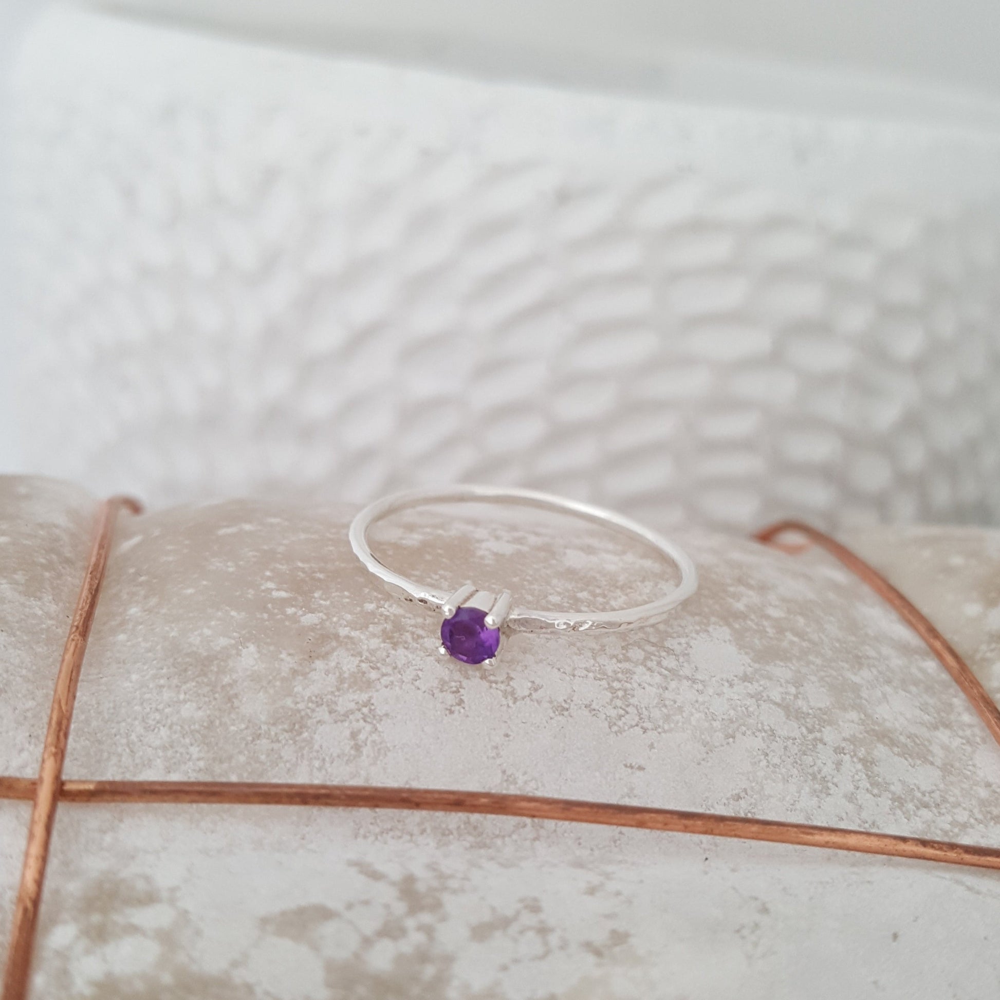 This Sterling Silver Stack Ring is set with a 3.5mm faceted genuine Amethyst gemstone. The band of the ring has a slight hammered texture to it.