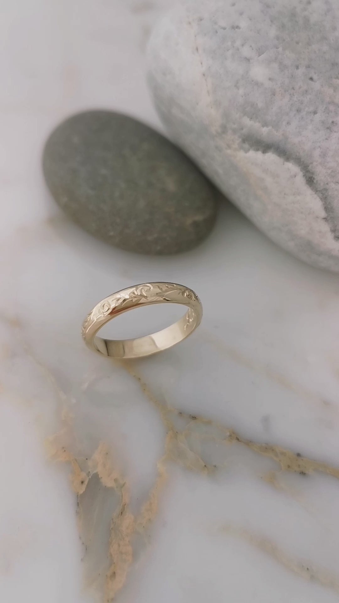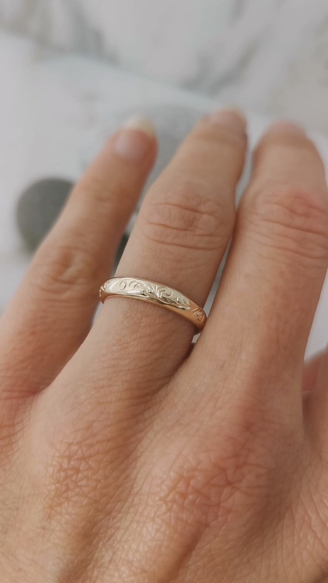 This stunning hand-engraved ring is perfect for an everyday dress ring or even as a wedding band. It measures 3.5mm wide and is rounded on top.