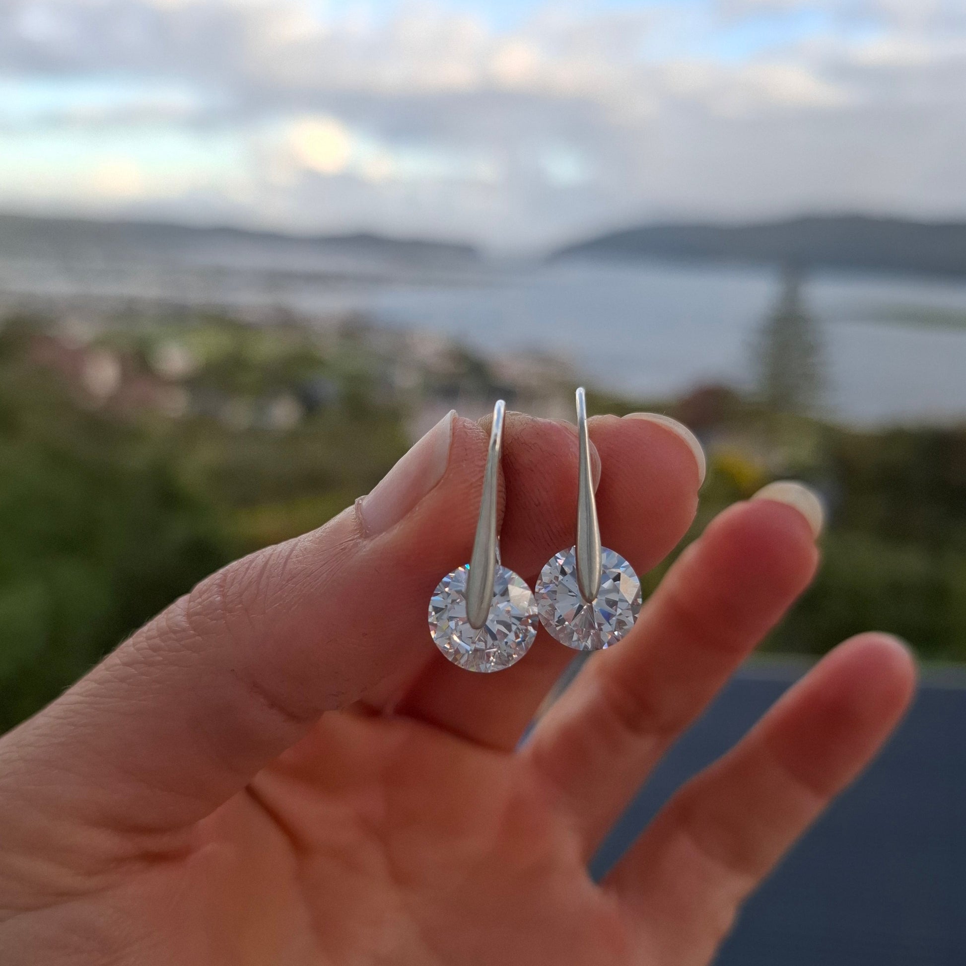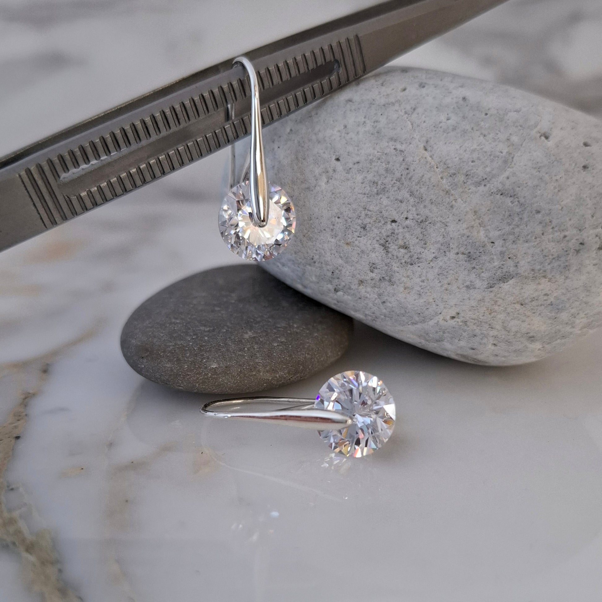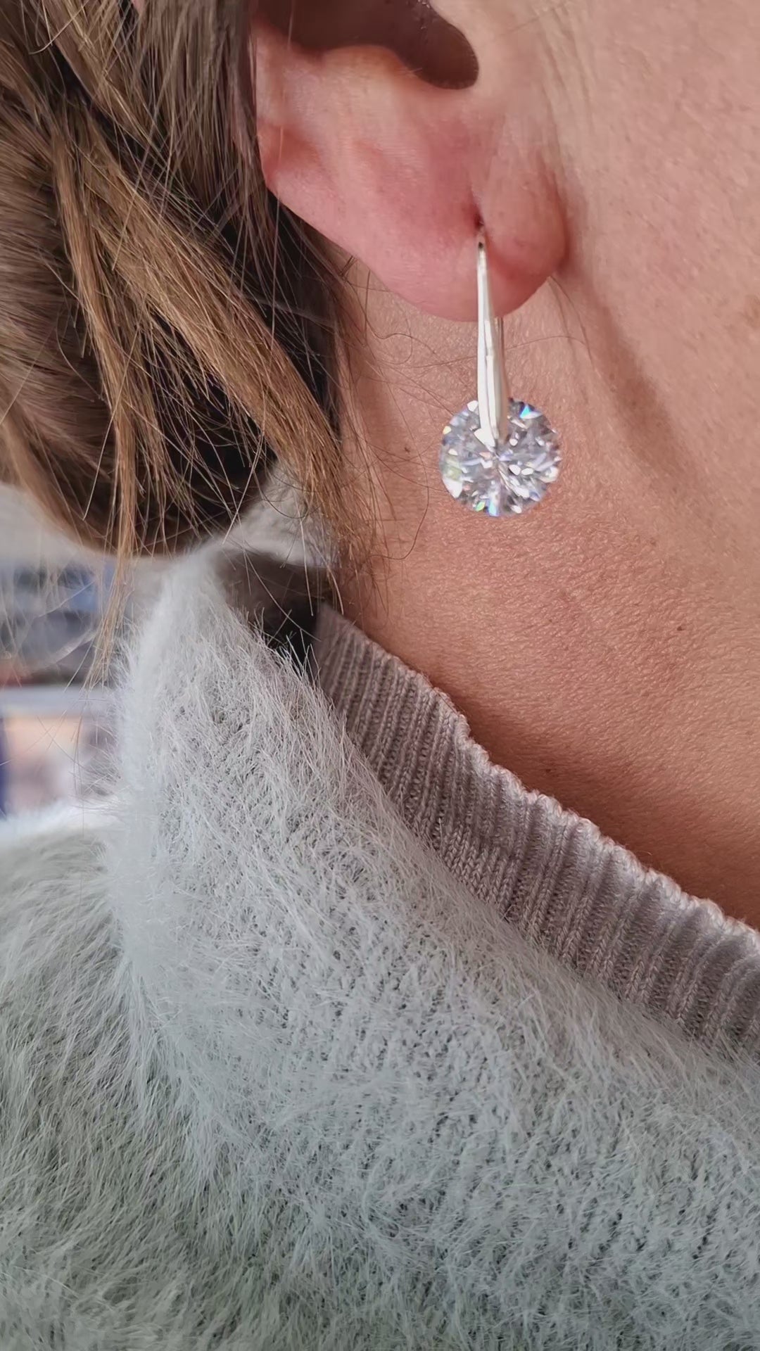 These elegant drop earrings with 2 x 10mm round swiss cubic zirconia gems, catch the light and sparkle with every movement. They measure 24mm long and are designed to dangle just below the earlobe for a clean minimalist style.