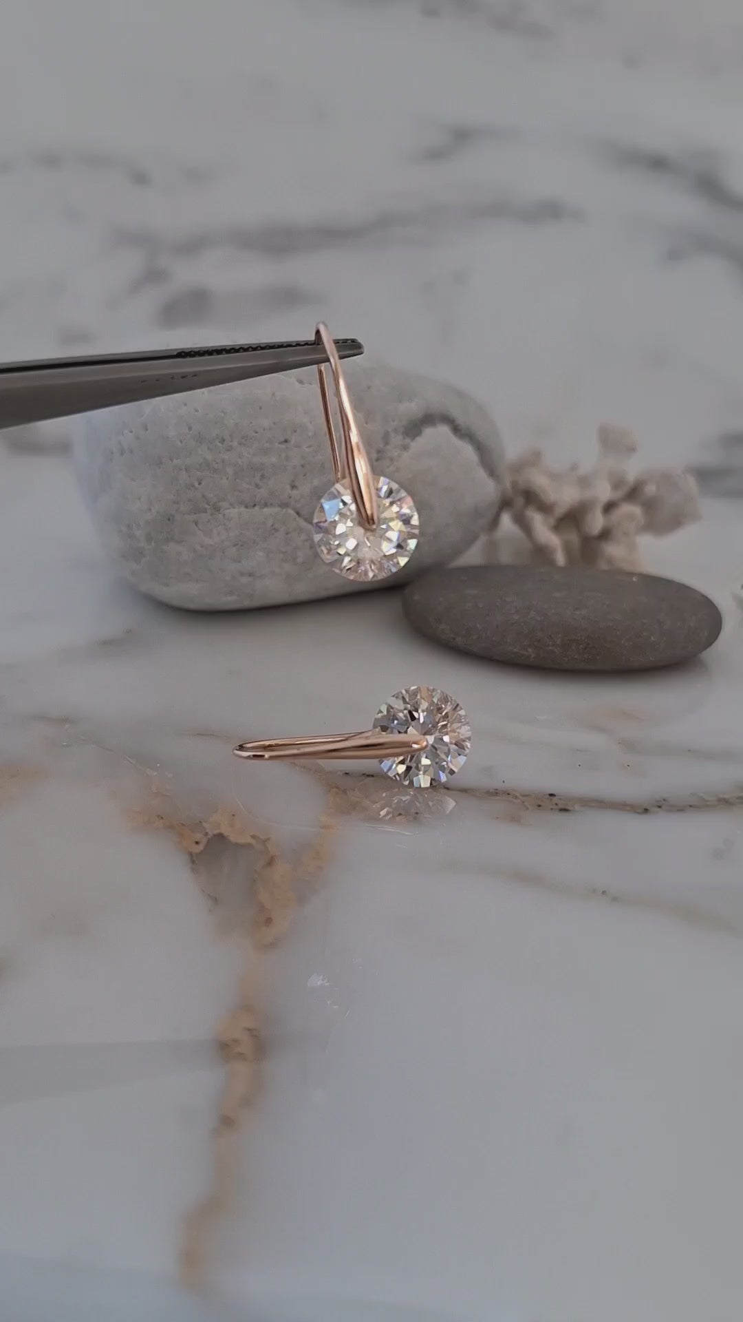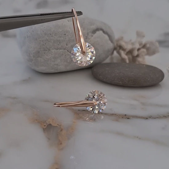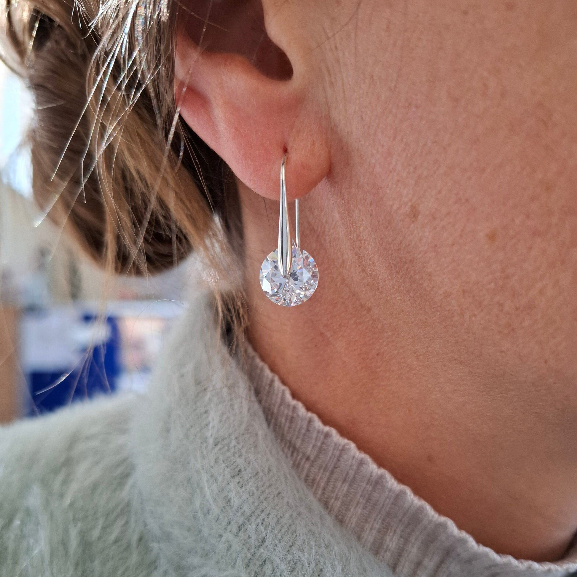 These elegant drop earrings with 2 x 10mm round swiss cubic zirconia gems, catch the light and sparkle with every movement. They measure 24mm long and are designed to dangle just below the earlobe for a clean minimalist style.