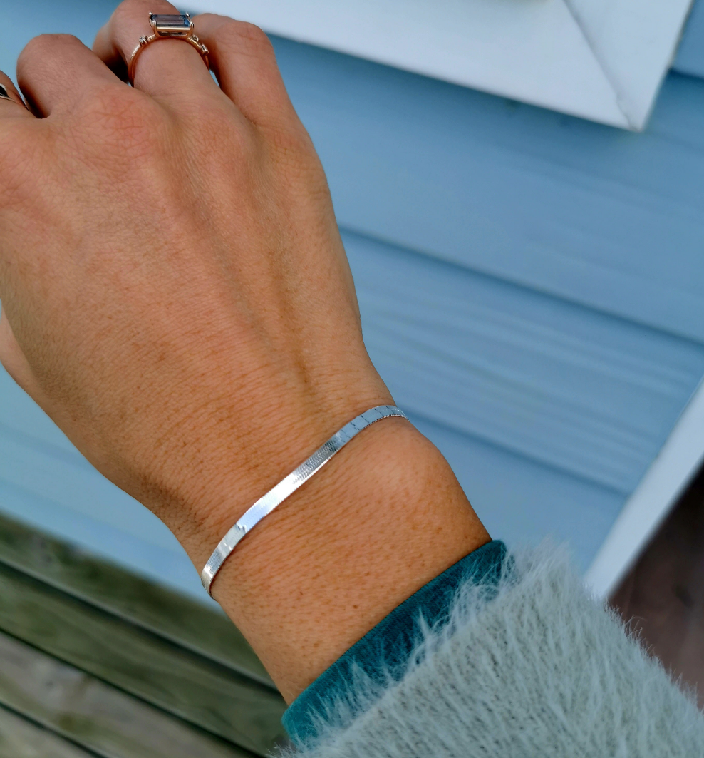 This silver herringbone bracelet is absolutely beautiful! The design is sleek and polished, catching the light perfectly. It sits comfortably on the wrist and adds a touch of elegance to any outfit, whether casual or formal. A timeless piece that I highly recommend! Thank you Yolande 🩷