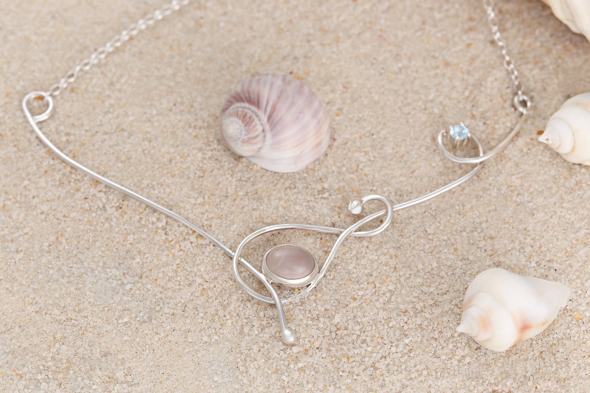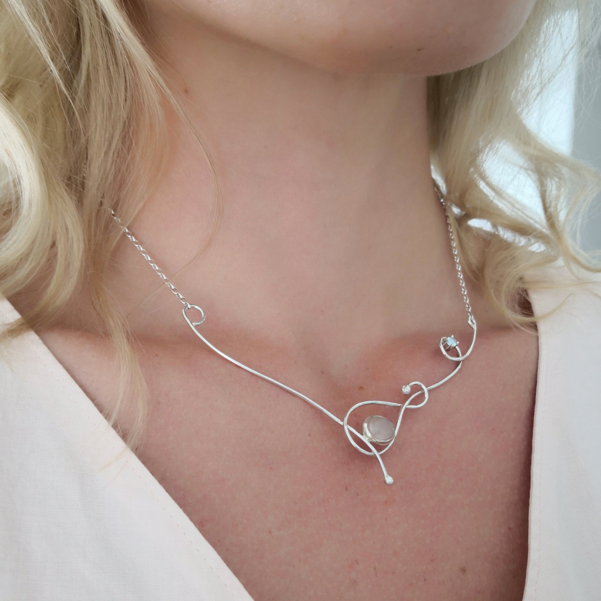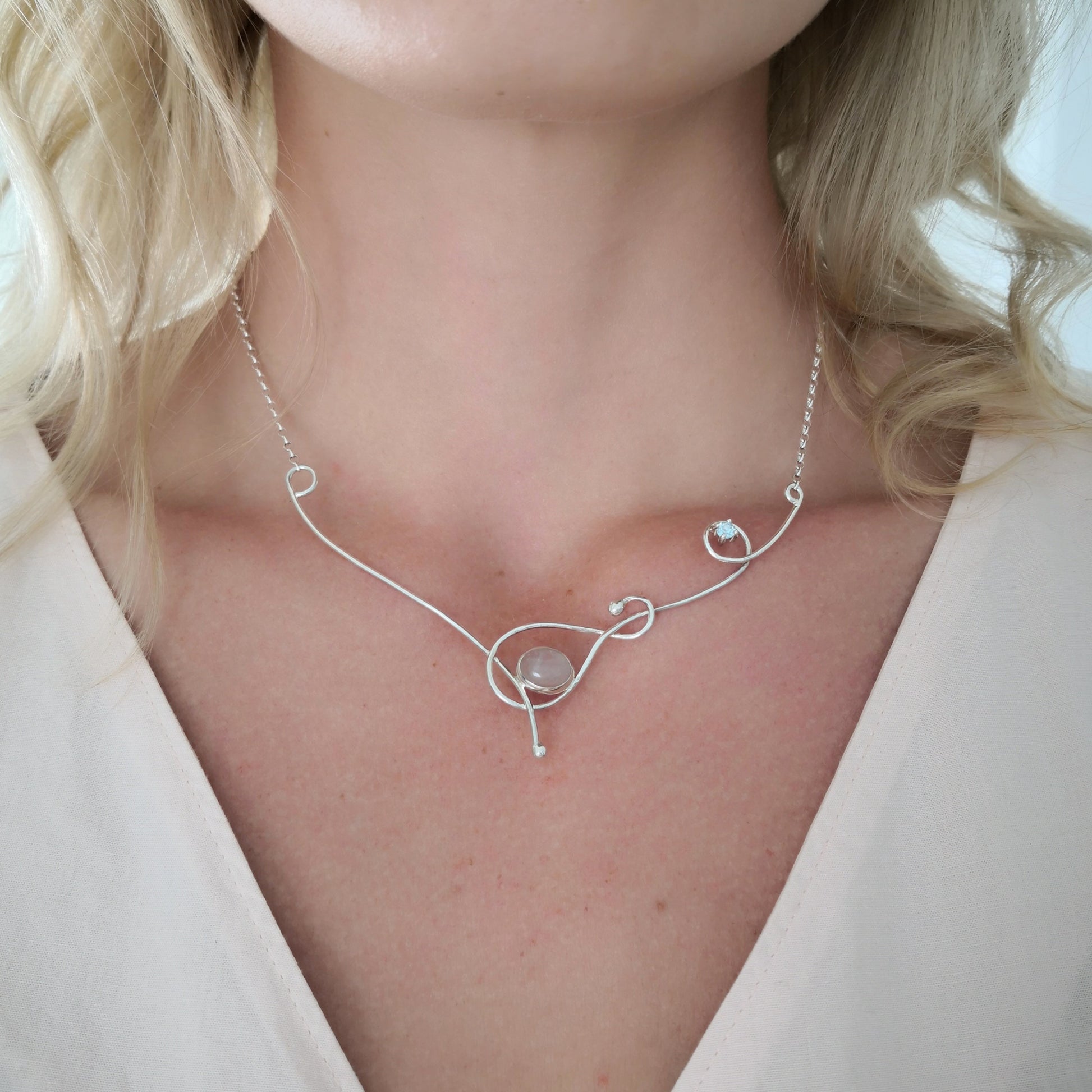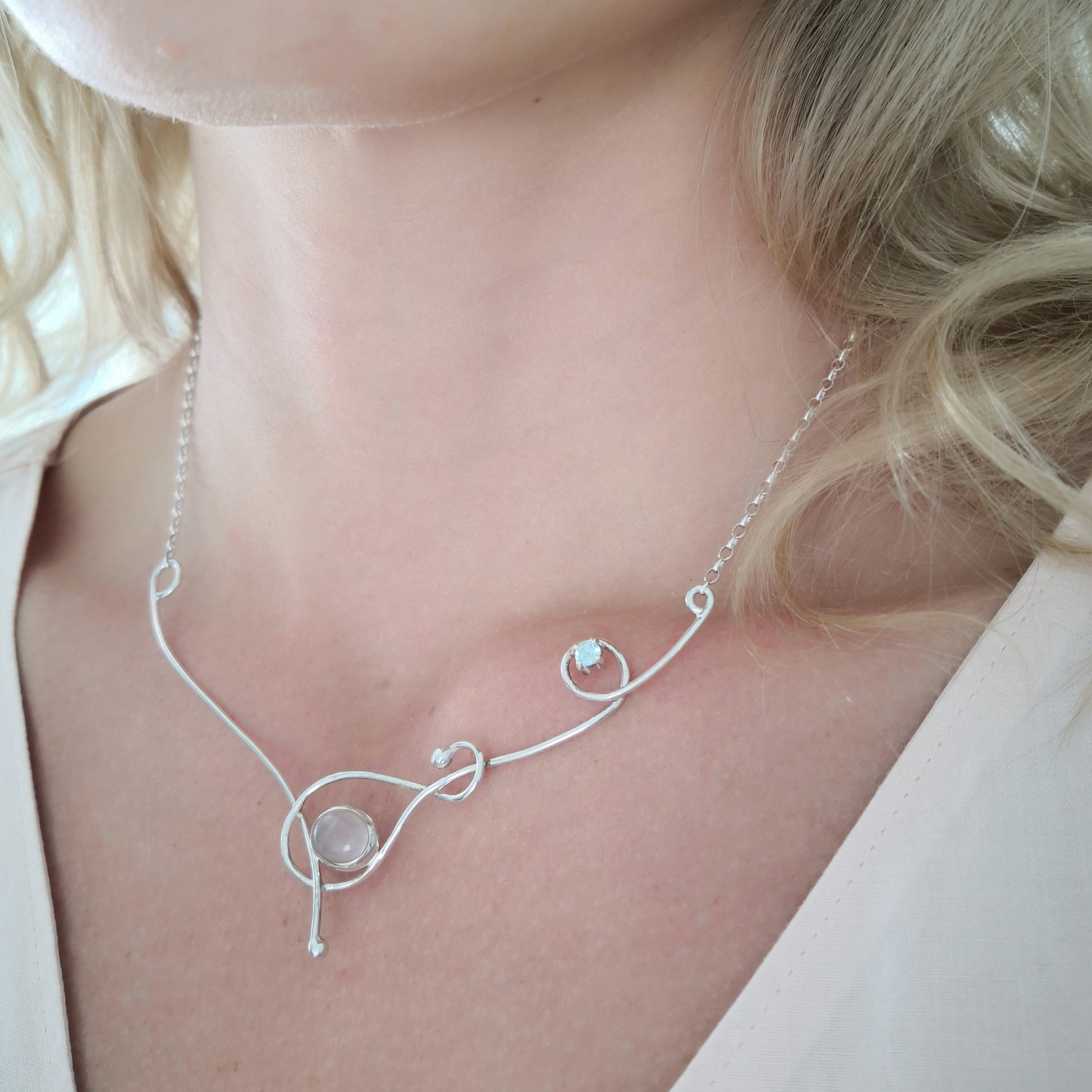 Silver Wistful Wave Necklace with Rose Quartz and Blue Topaz Gemstones