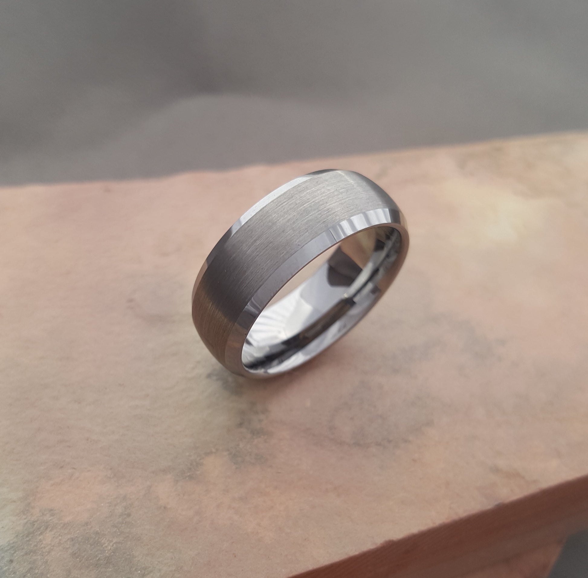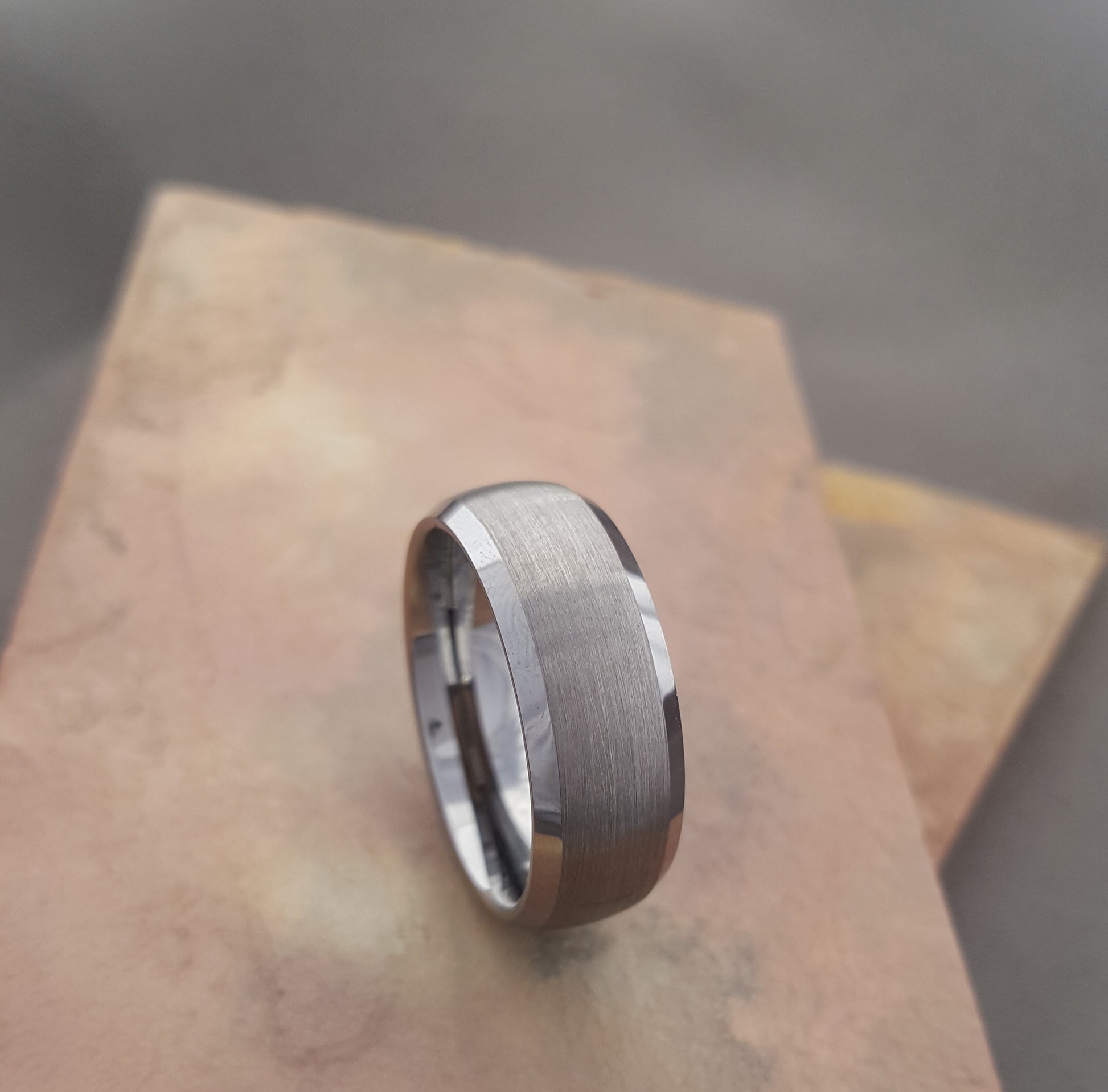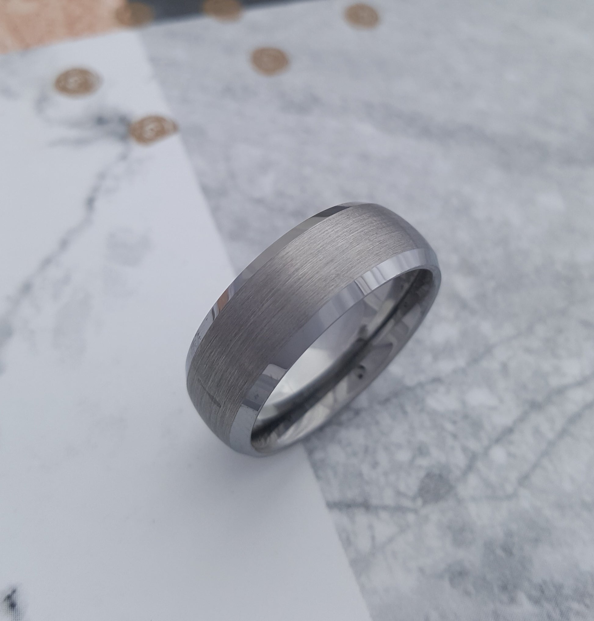8mm wide Tungsten gents ring with a brushed finish in the centre and polished beveled edges on the sides.