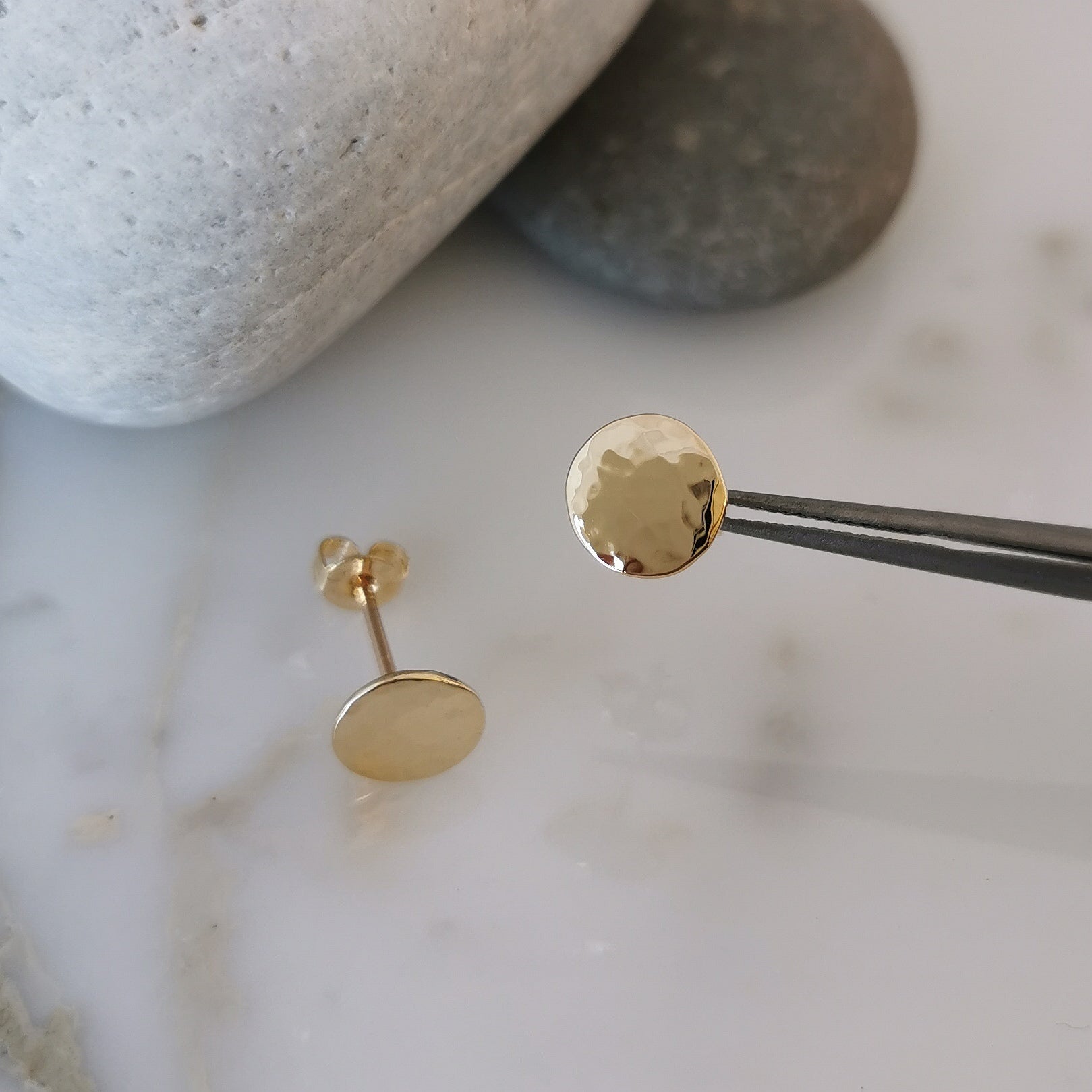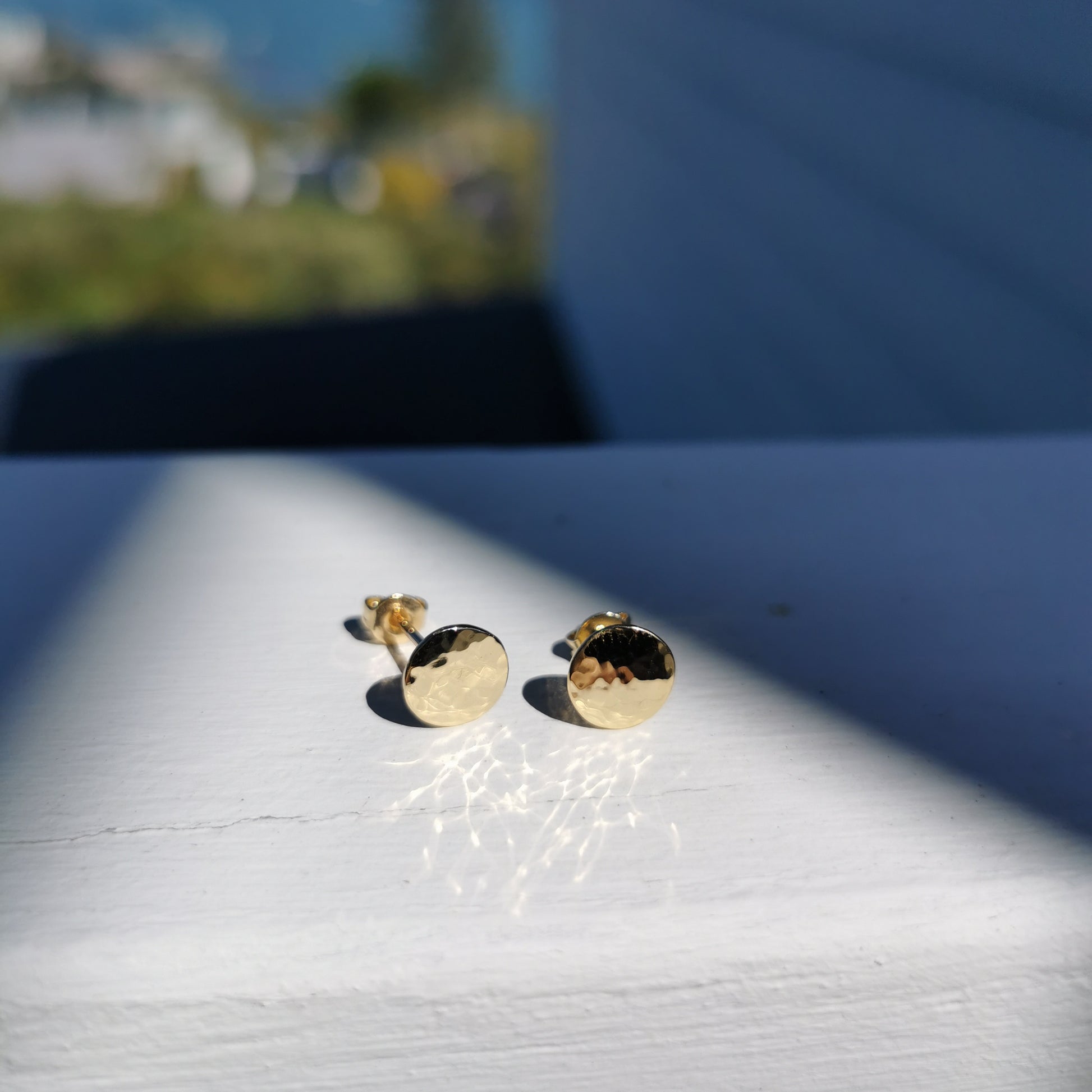 The perfect leave-in holiday earrings! These 8mm hammered gold studs catch the sunlight as you wear them, and have that simple sophistication.