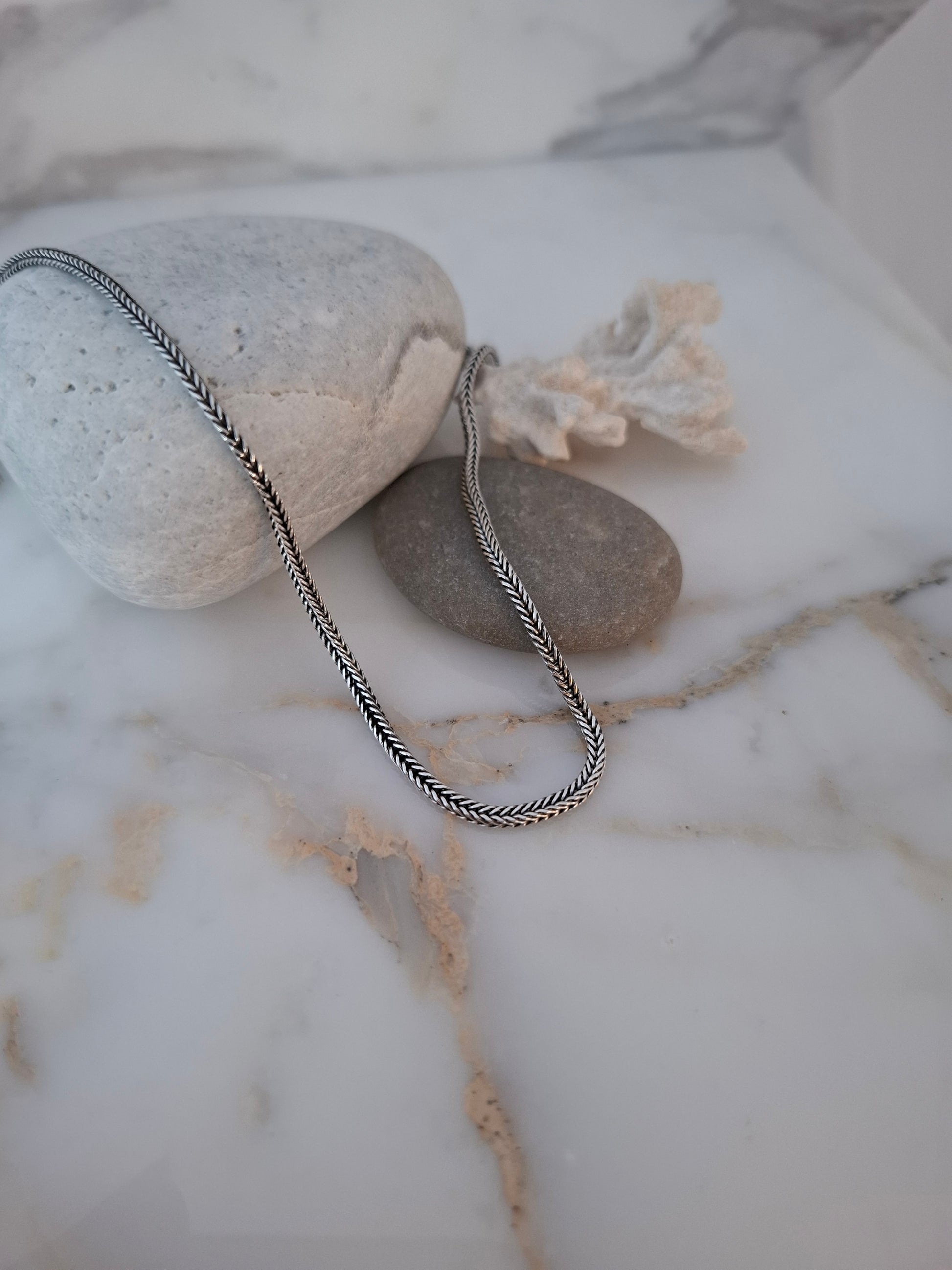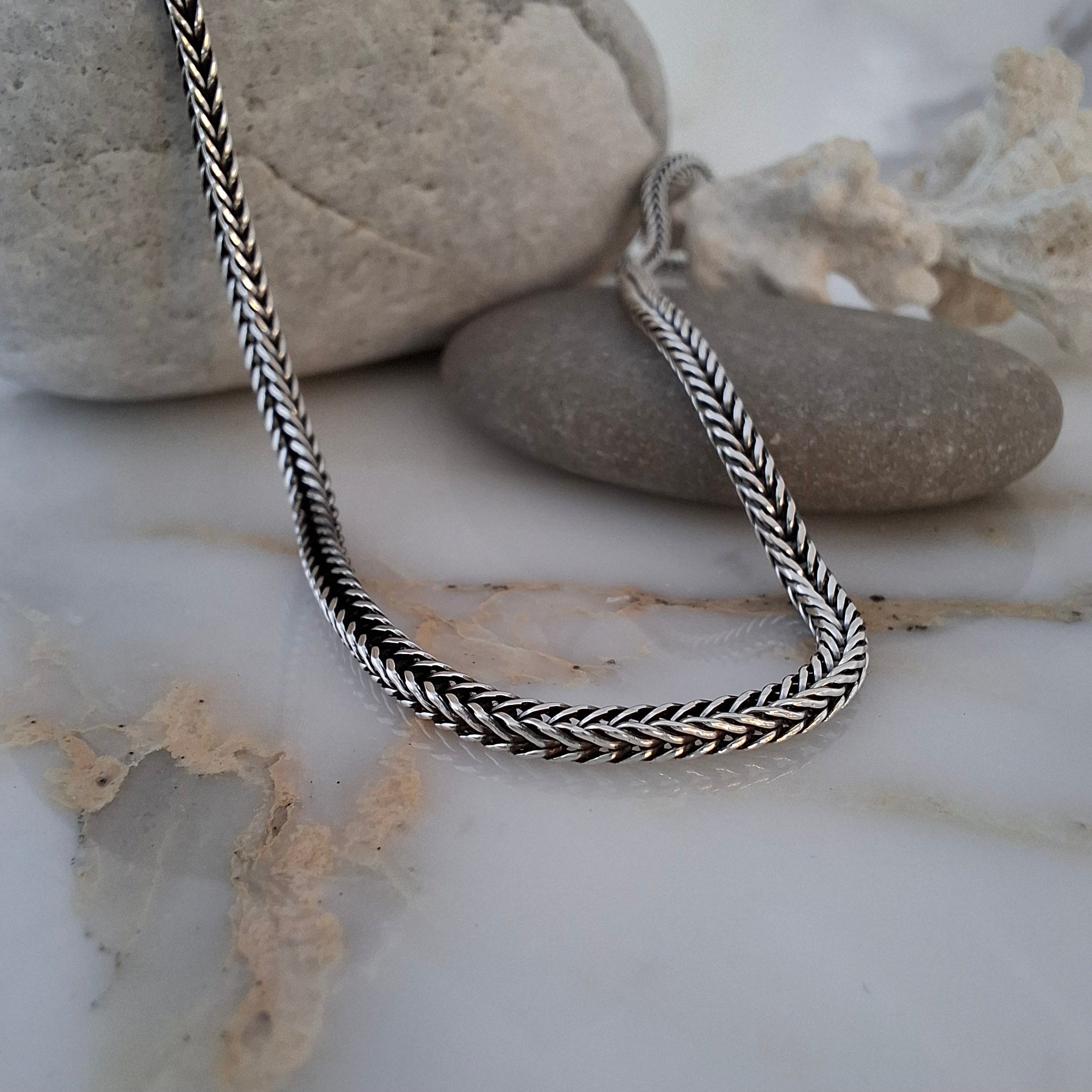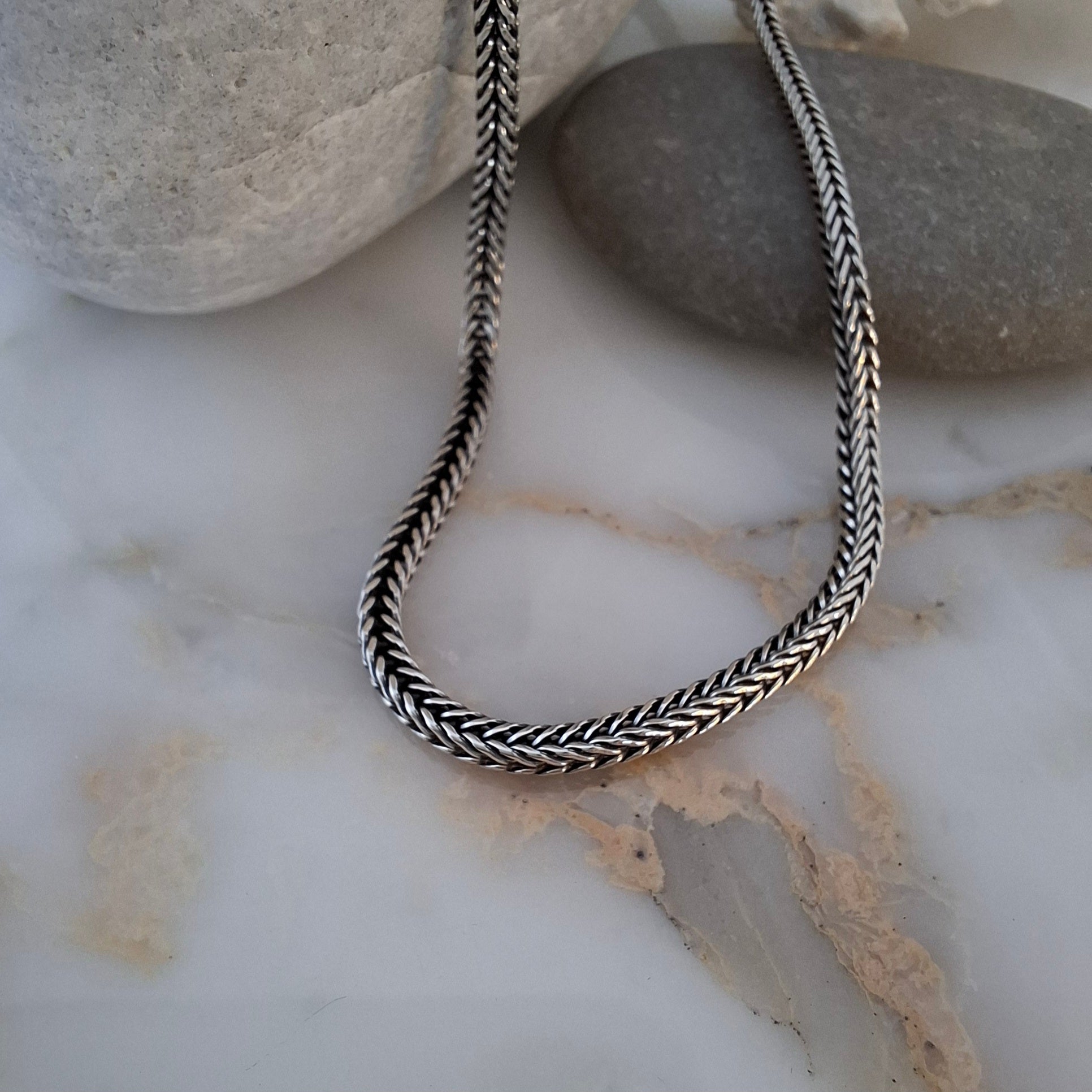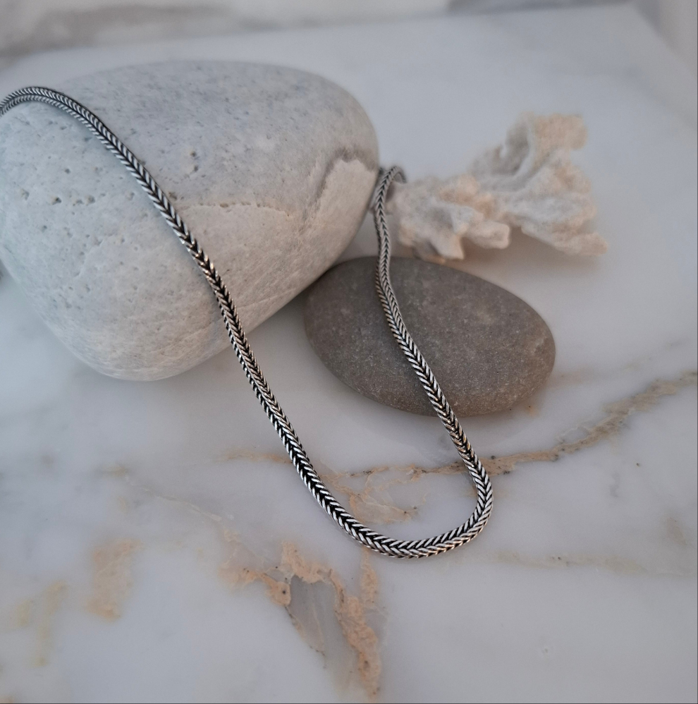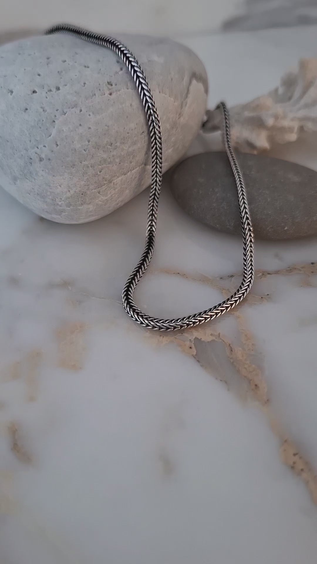 An oxidised/blackened version of the striking silver foxtail necklace to create that vintage silver chain look and feel. Solid sterling silver and measuring 2.2mm wide. These gorgeous vintage feel necklaces are bold enough to be worn alone or with your favourite bead charms or vintage silver pendant.